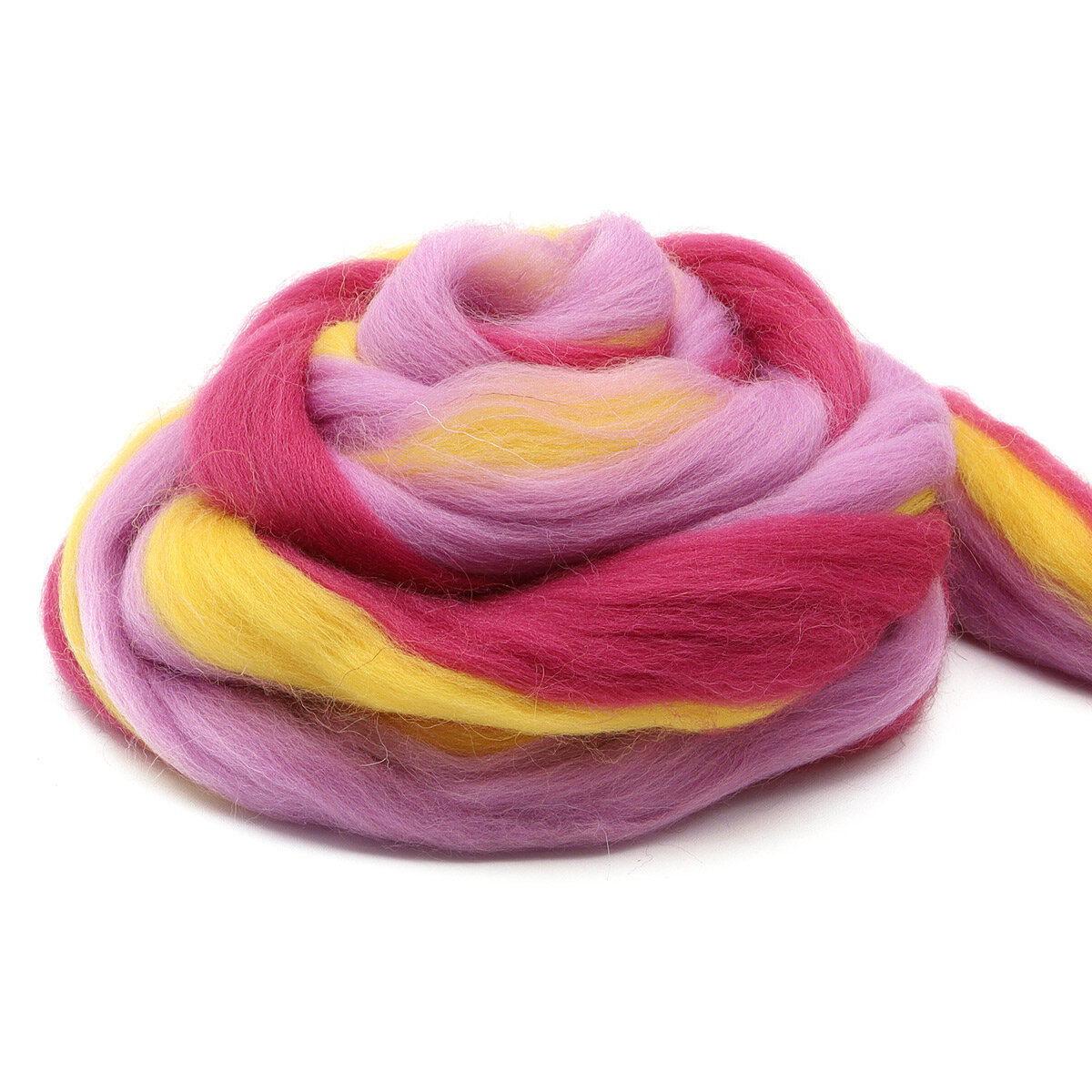 Купить Шерсть для валяния полутонкая 100%, мультиколор, 100 г (1509 жёлтый, светлая фиалка, темный цикламен)