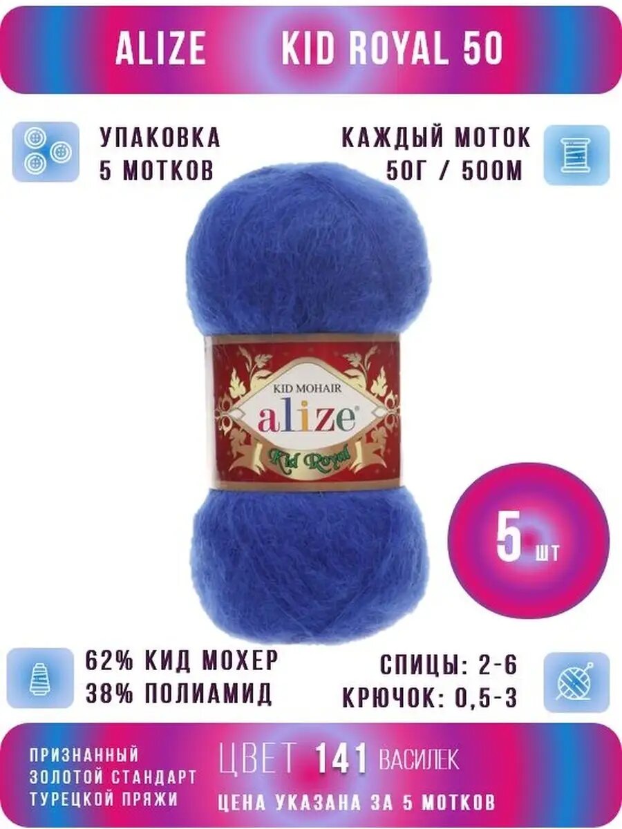 Купить Пряжа Alize Kid Royal 50 василек (141), 62%кид мохер/38%полиамид, 500м, 50г, 5шт