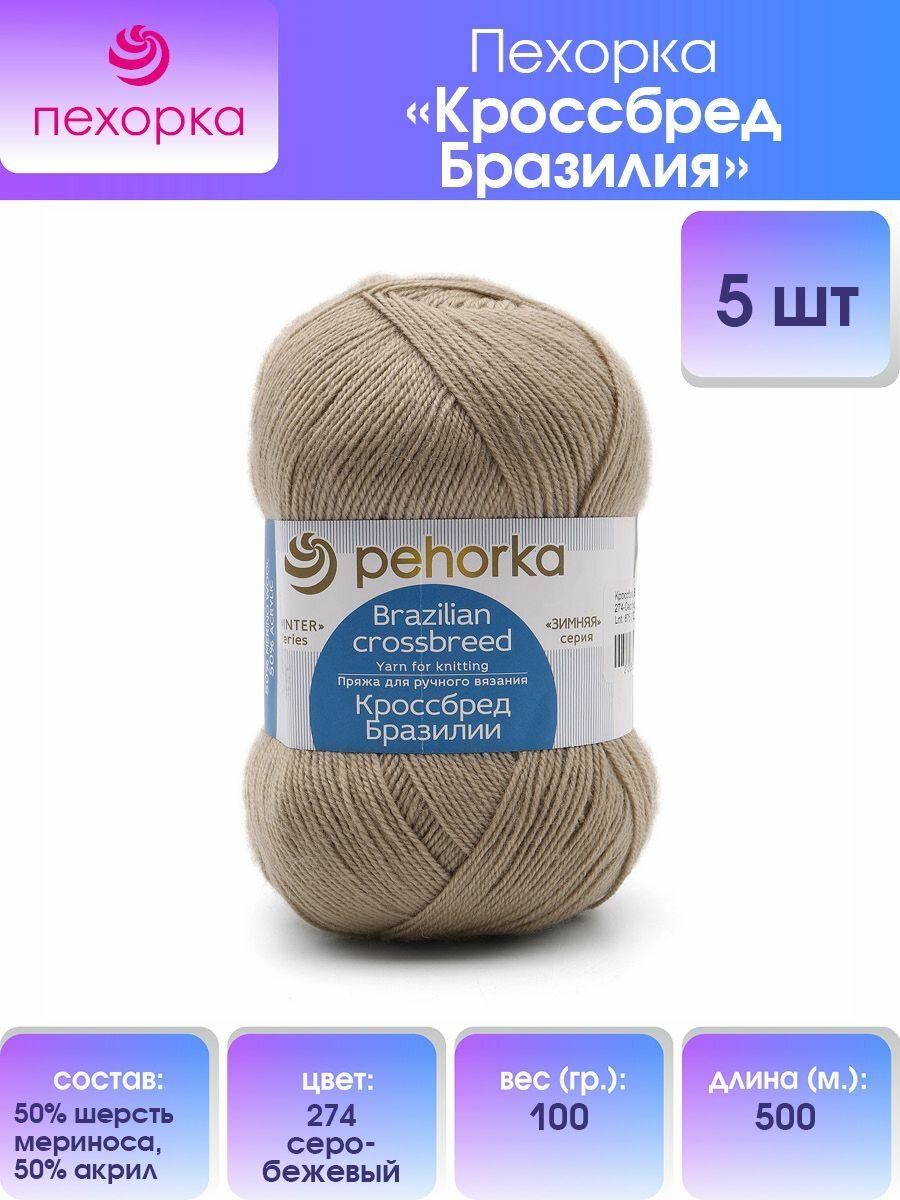 Пряжа Пехорка Кроссбред Бразилии, шерсть, акрил, 5х100 г, 490 м, цвет 274 серо-бежевый