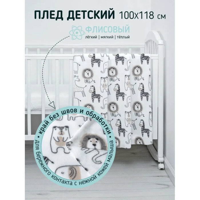 Плед для новорожденных флисовый в кроватку, коляску 100х118 см "Джунгли"