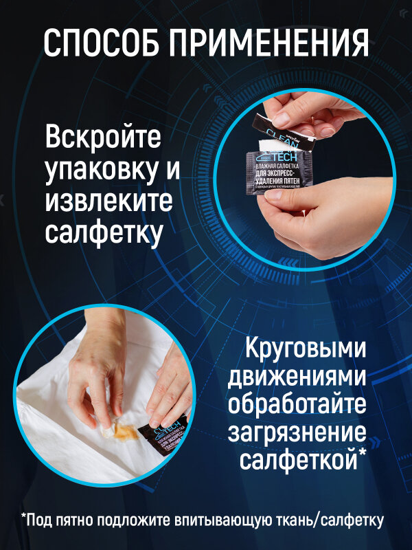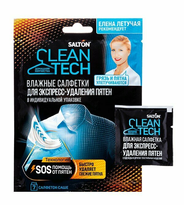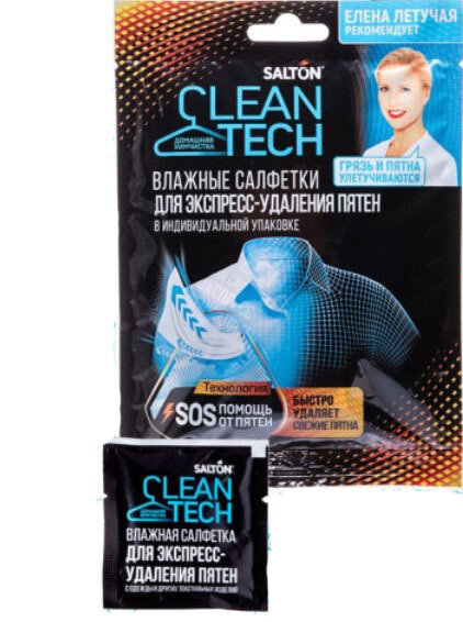 | Способ применения | Вскройте упаковку и извлеките салфетку. Под пятно подложите впитывающую ткань. Круговыми движениями обработайте загрязнение влажной салфеткой Salton CleanTech. |