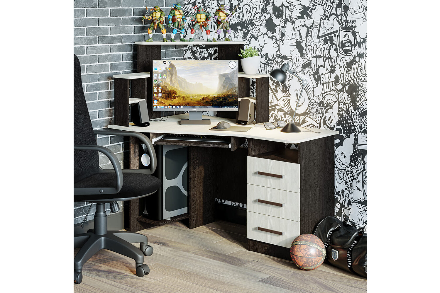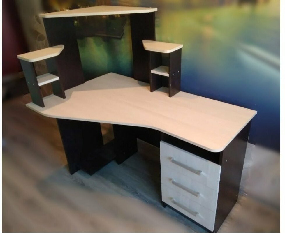 Компьютерный, письменный угловой стол Тамин с ящиками, надстройкой, полками, тумбой, 130х80х130 см, Венге / Лоредо