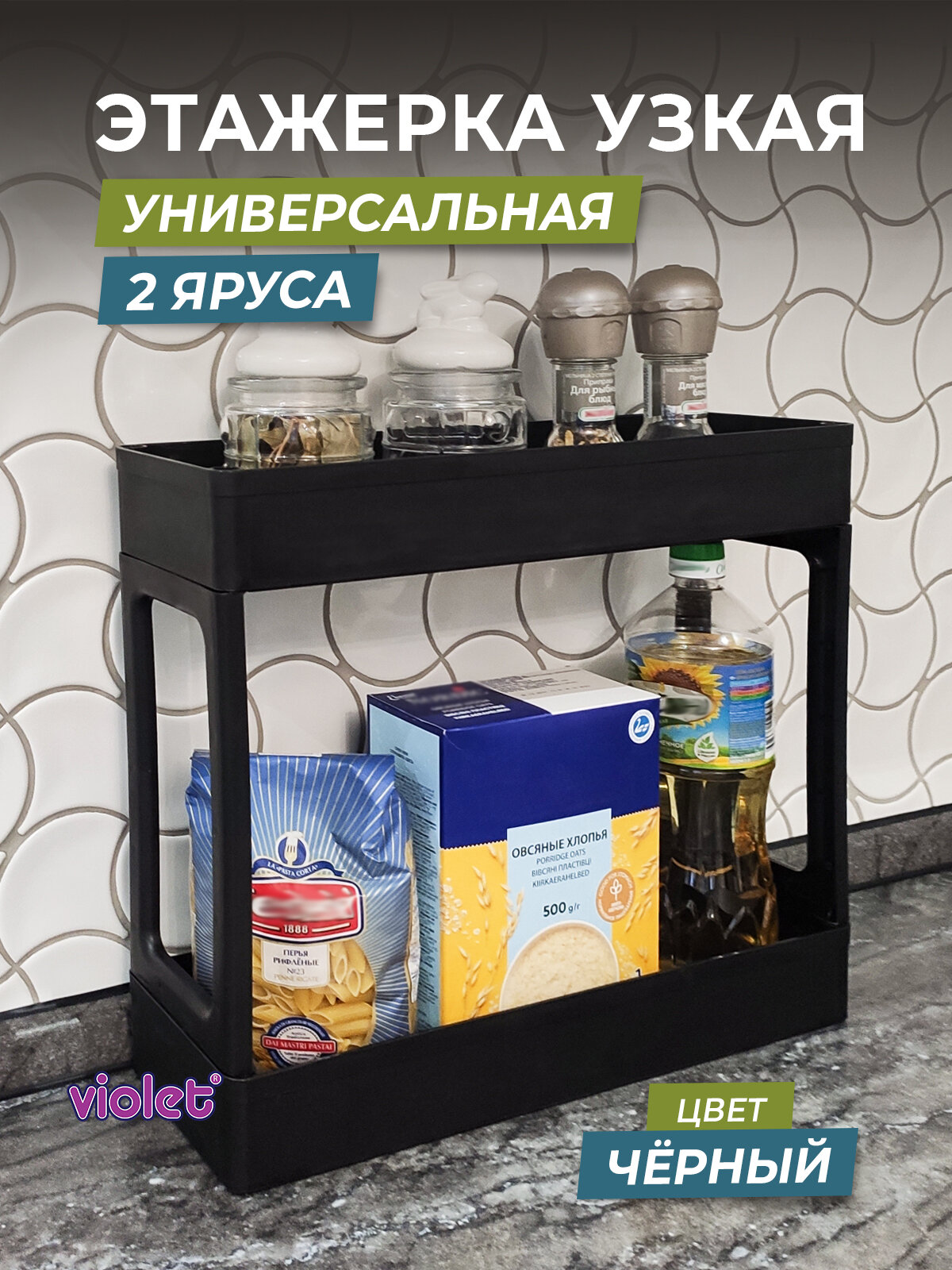 Купить Этажерка для хранения Violet 2х ярусная узкая, цвет черный / стеллаж для кухни и ванной