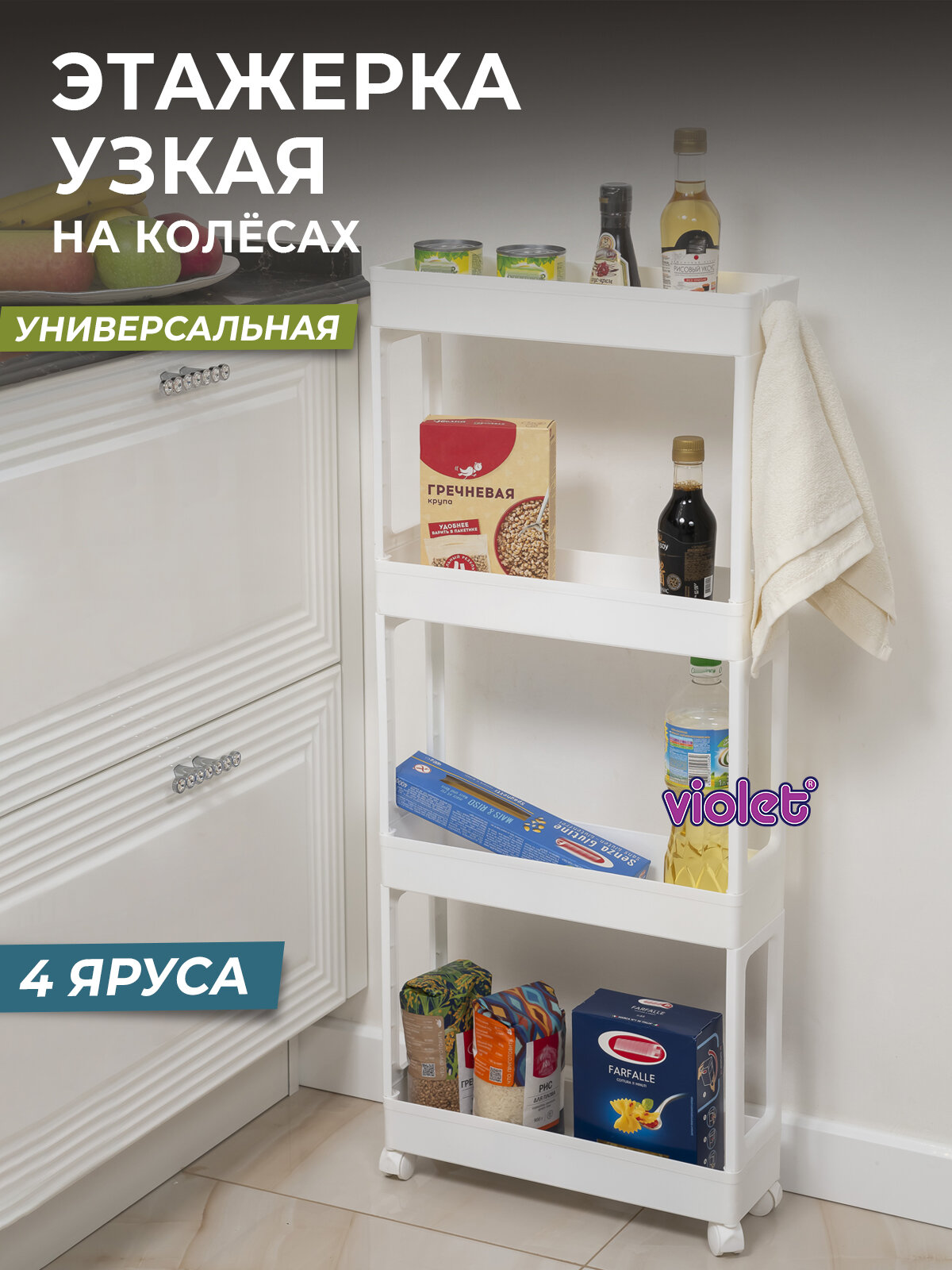 Купить Этажерка для хранения Violet 4х ярусная узкая, цвет белый / стеллаж для кухни и ванной