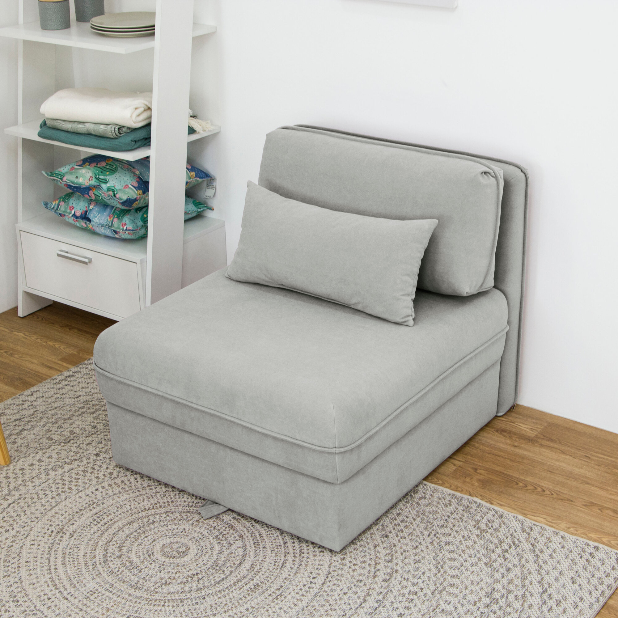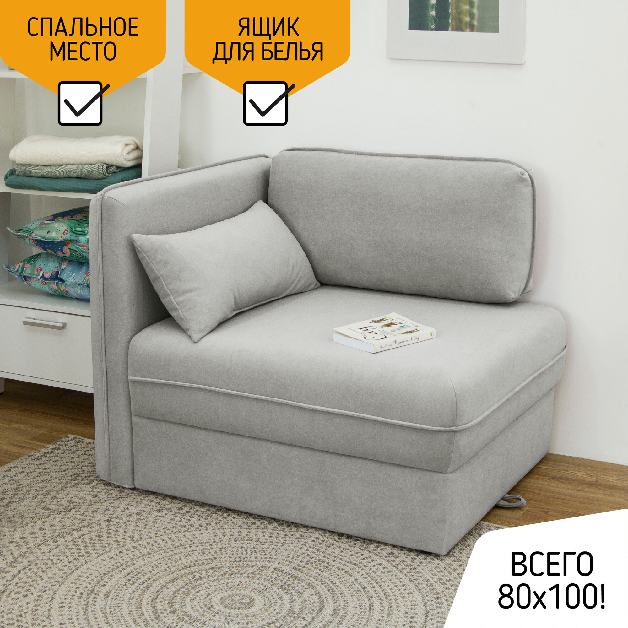 Купить Диван-кровать KRASDIVAN Олаф 80х100 см, с ящиком для белья, велюр Бахрия 11 светло-серый