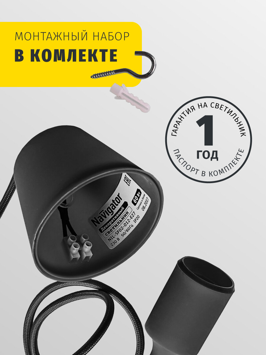 Потолочный светильник Navigator 61 523 NIL-SF02 шнур с патроном, цоколь Е27, черный
