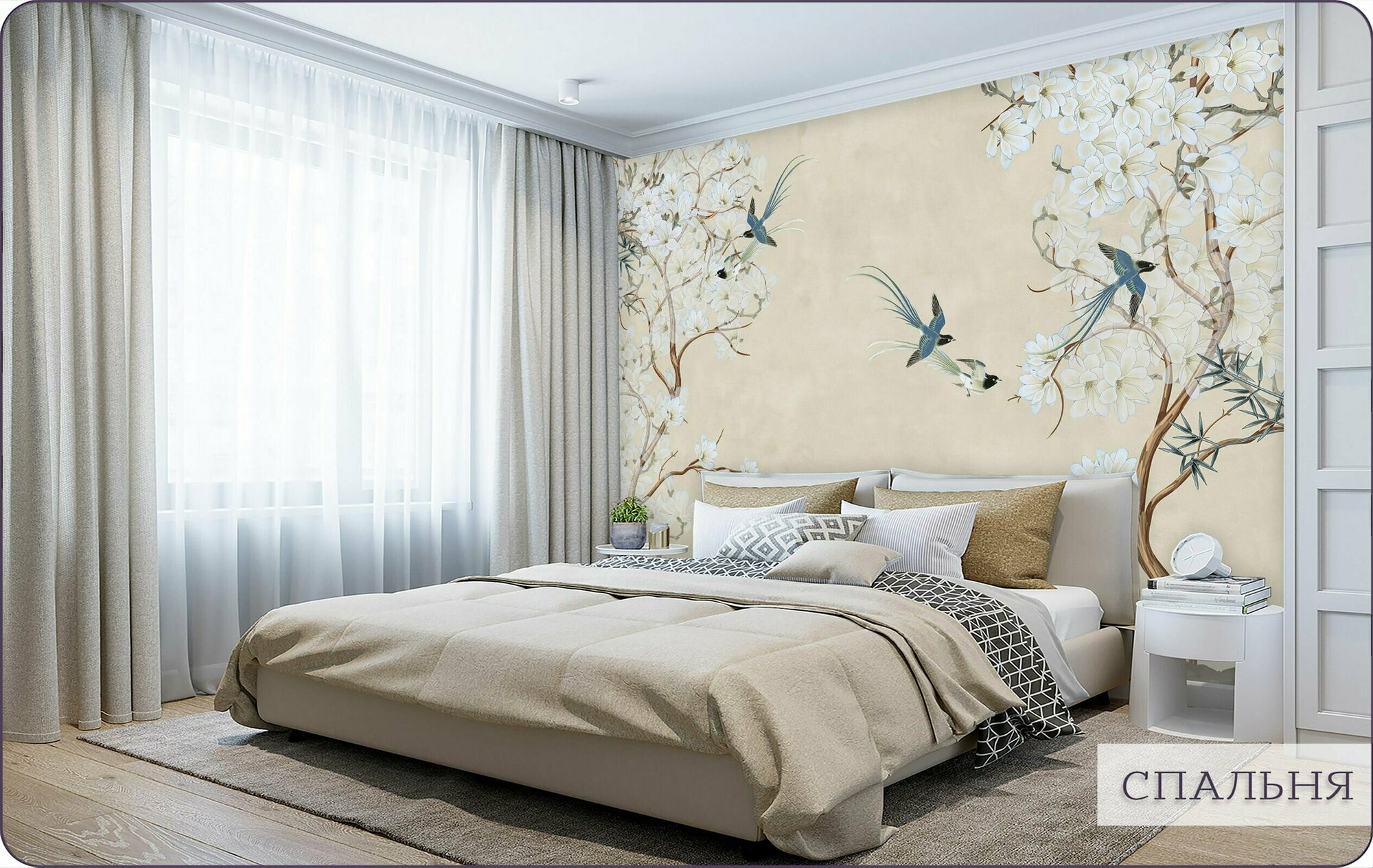 Фотообои на стену флизелиновые 3d Цветы Птицы Сакура 300х270 см Bartonwall F058