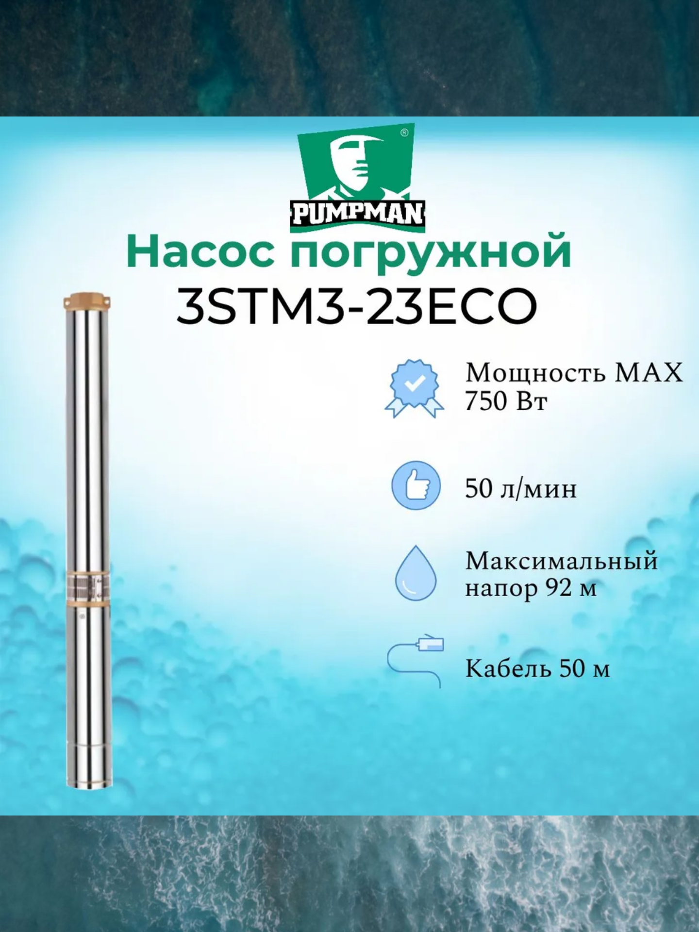 Скважинный насос 3STM3-23ECO PUMPMAN (750Вт, Hmax-92м, Qmax-3м3/ч, 50м кабель)