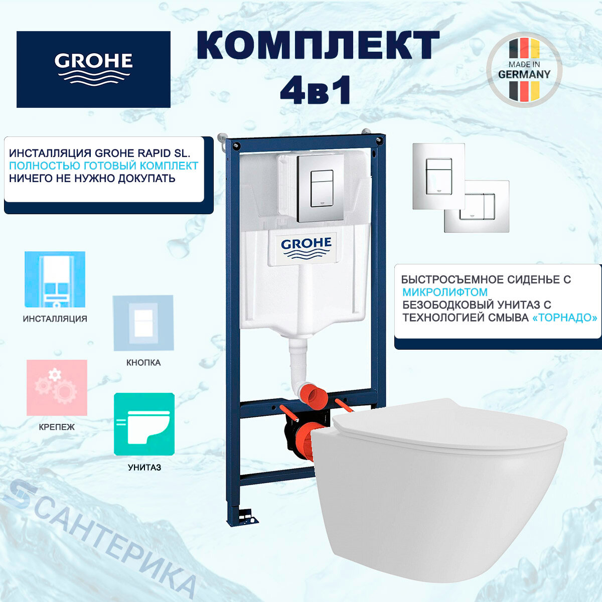 Купить Комплект 4в1 инсталляция для унитазов Grohe Rapid SL 38772001 + подвесной унитаз Santerika c технологией смыва "Торнадо" безободковый с крышкой микролифт