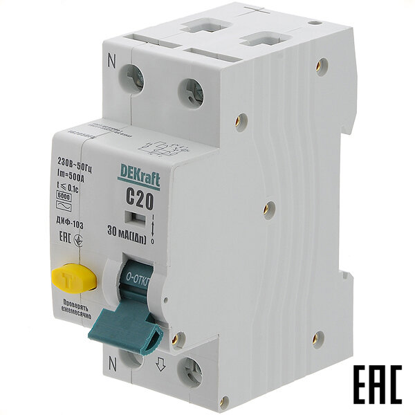 СохранитьАвтоматический выключатель дифференциального тока DEKraft 1Р+N 20А, 30мА, тип AC, C ДИФ-103 6 кА, 16205DEK интересное:
