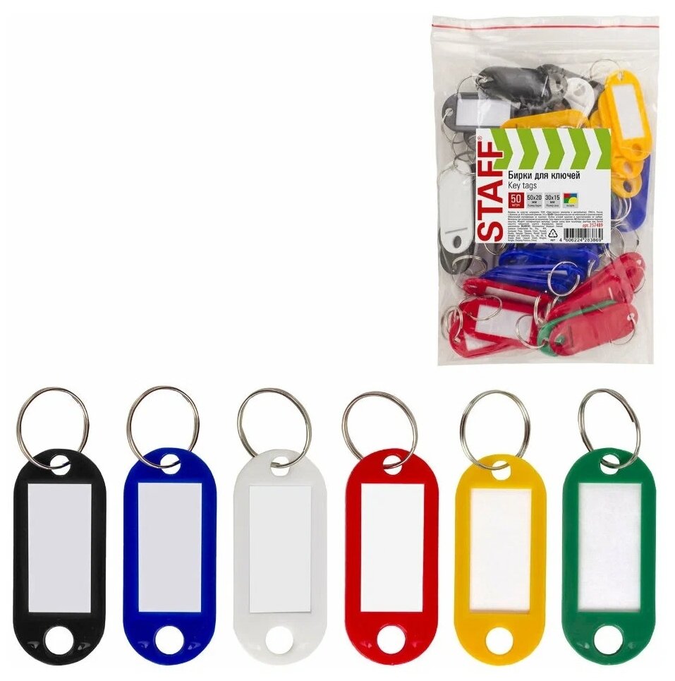 Бирки для ключей комплект 50 ШТ., длина 50 мм, инфо-окно 30х15 мм, ассорти, STAFF, 237489