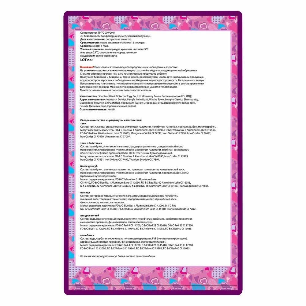 | Подробная комплектация | тени для век 5 оттенков по 3 г, помада 2 оттенка по 1,6 г, блеск для губ 6 оттенков по 3,5 г, лак для ногтей 5 г, аппликатор 2 шт,, заколки 2 шт, |