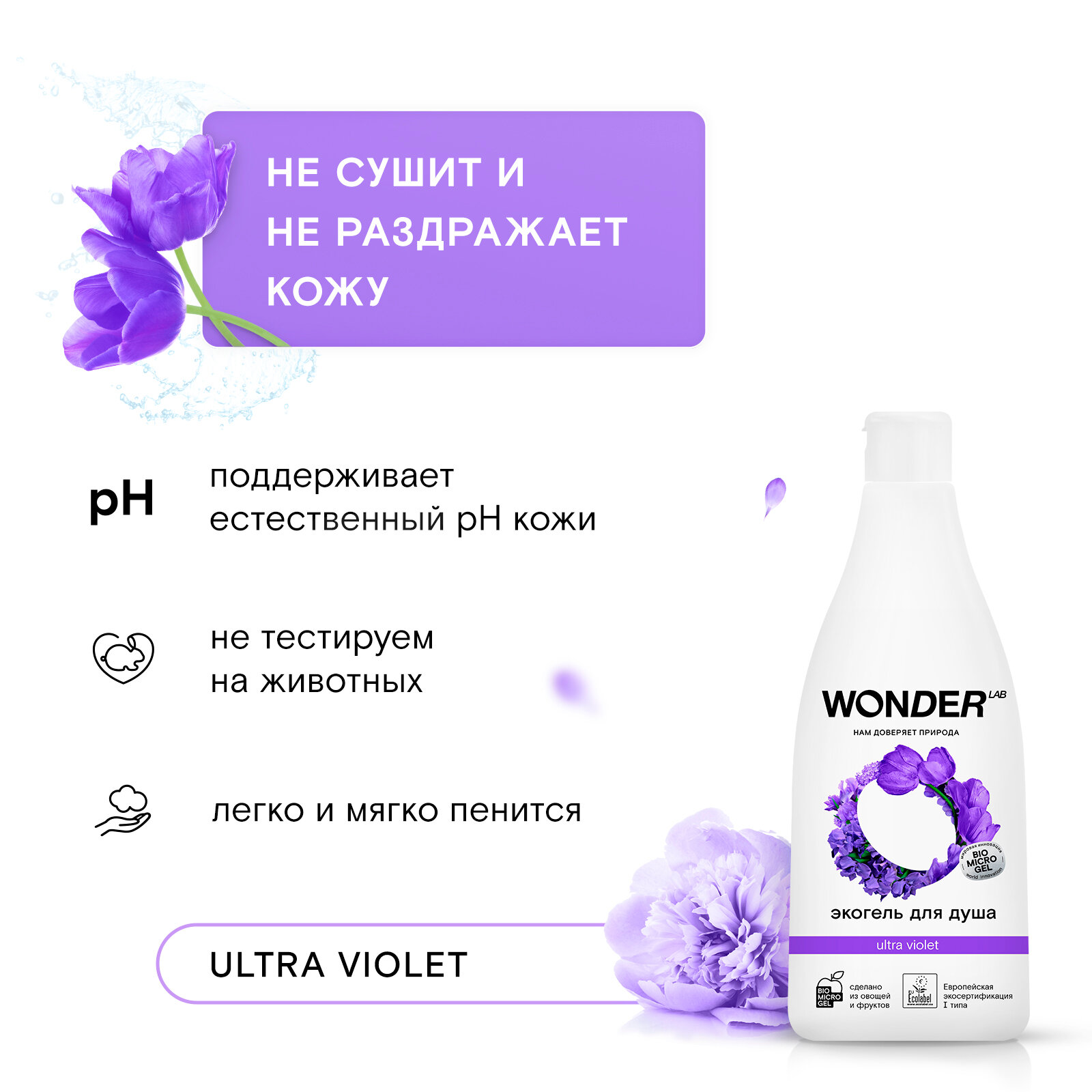 Эко гель для душа увлажняющий Ultra violet с ароматом полевых цветов WONDER LAB, 550 мл