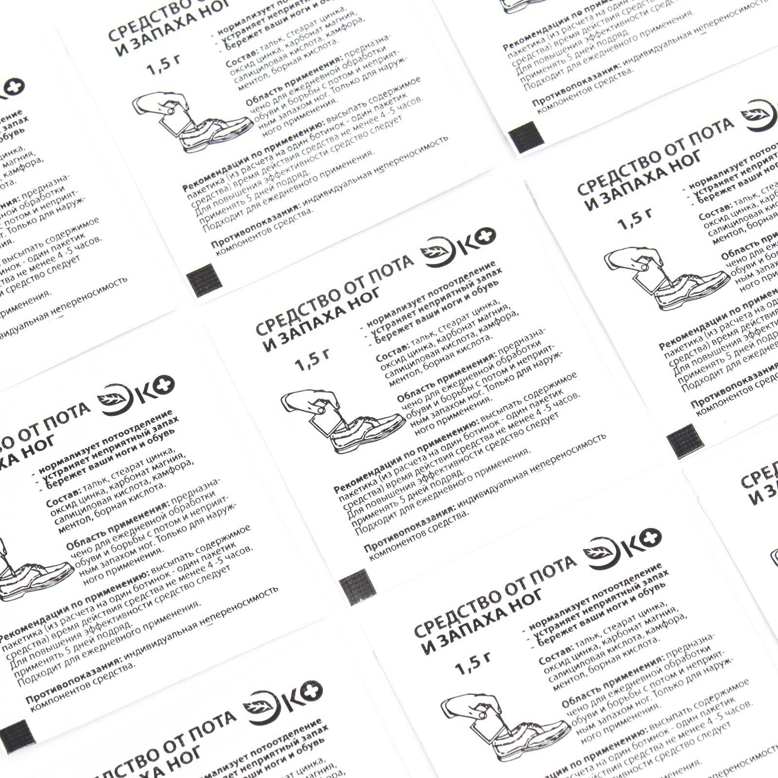| Комплектация | 10 пакетиков средства от пота и запаха ног |