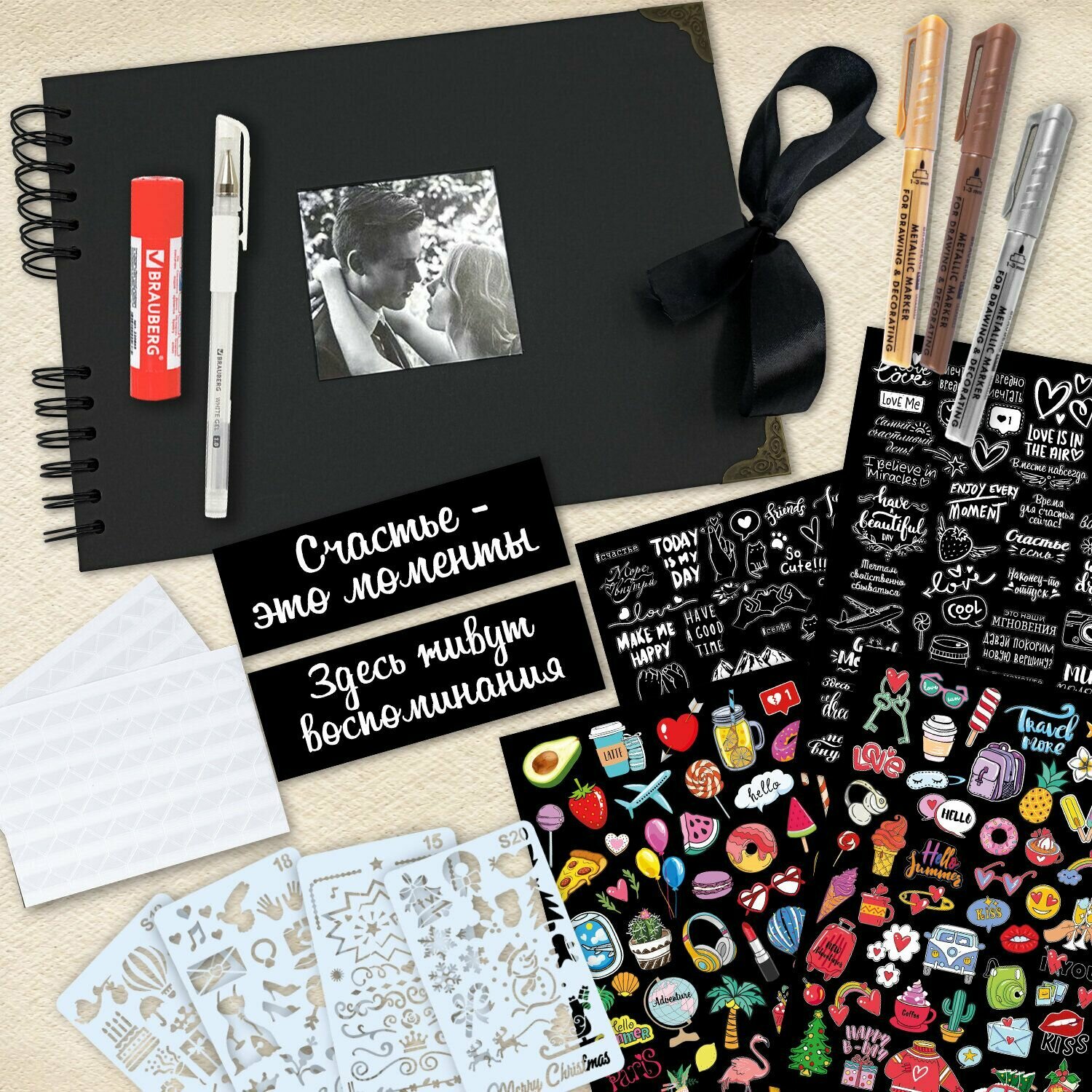 Набор для создания фотоальбома Brauberg "Счастье - это моменты", 24 листа, 22х30 см, уголки, стикеры, ручка, клей