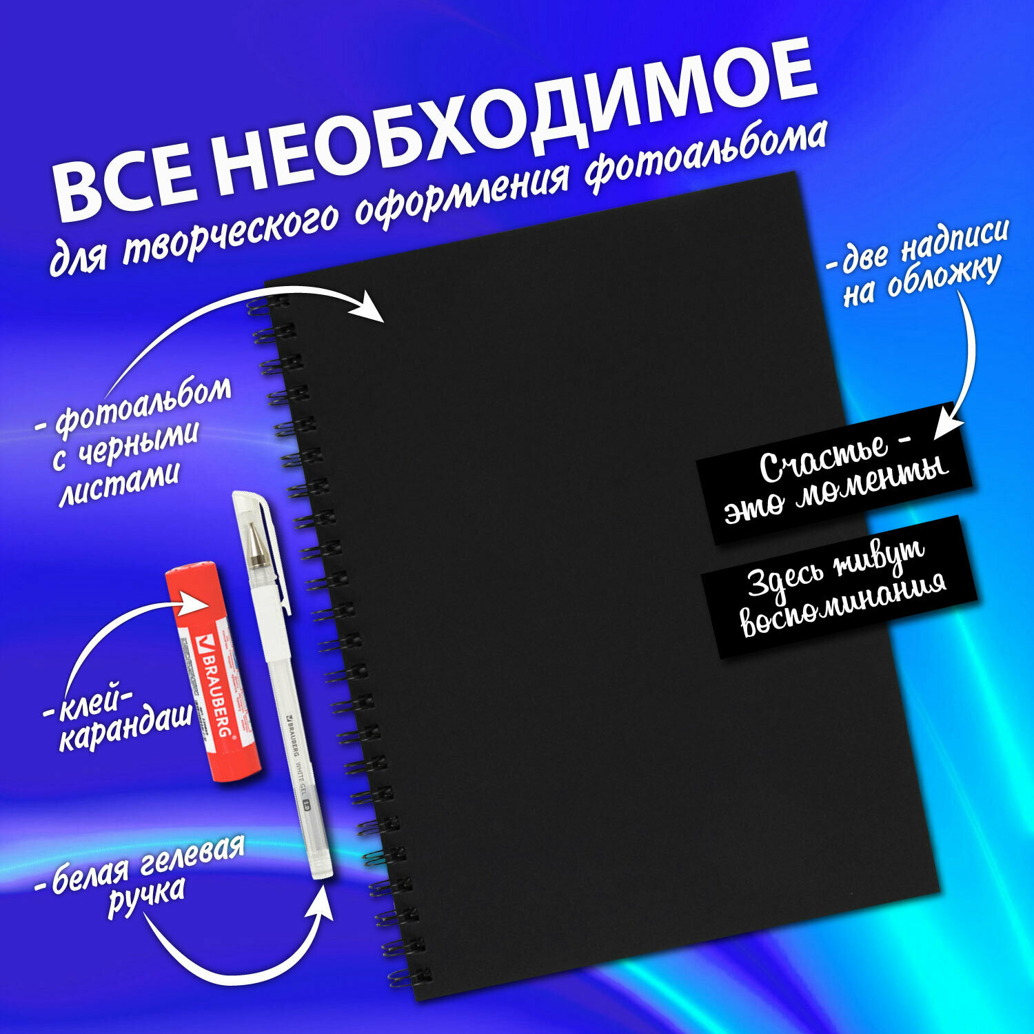 Фотоальбом детский семейный свадебный для фото с черными листами "Счастье – это моменты" 22х30 см, 24 черных листа, уголки, стикеры, ручка, клей, Brauberg, 391310