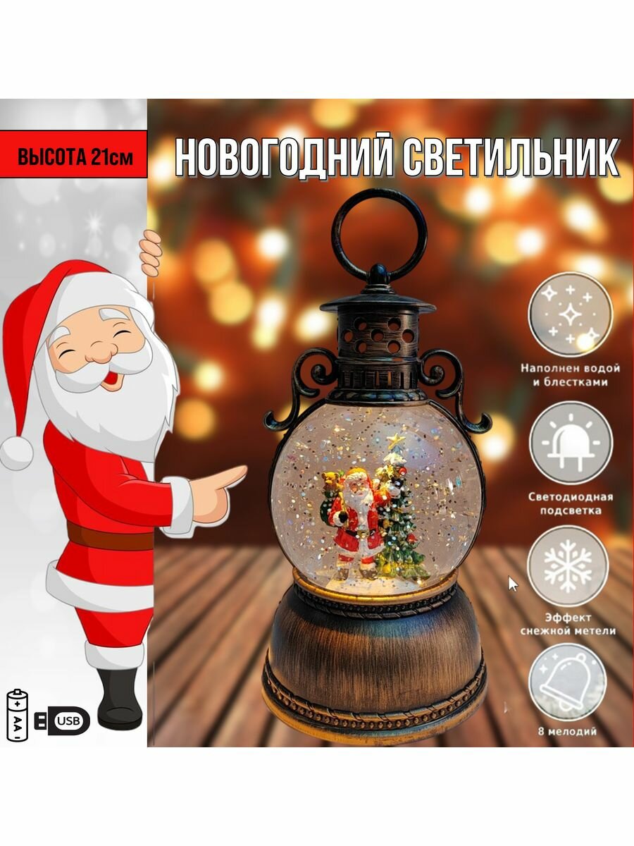 Большой Новогодний фонарь и светильник "Дед мороз" с музыкой и снегом