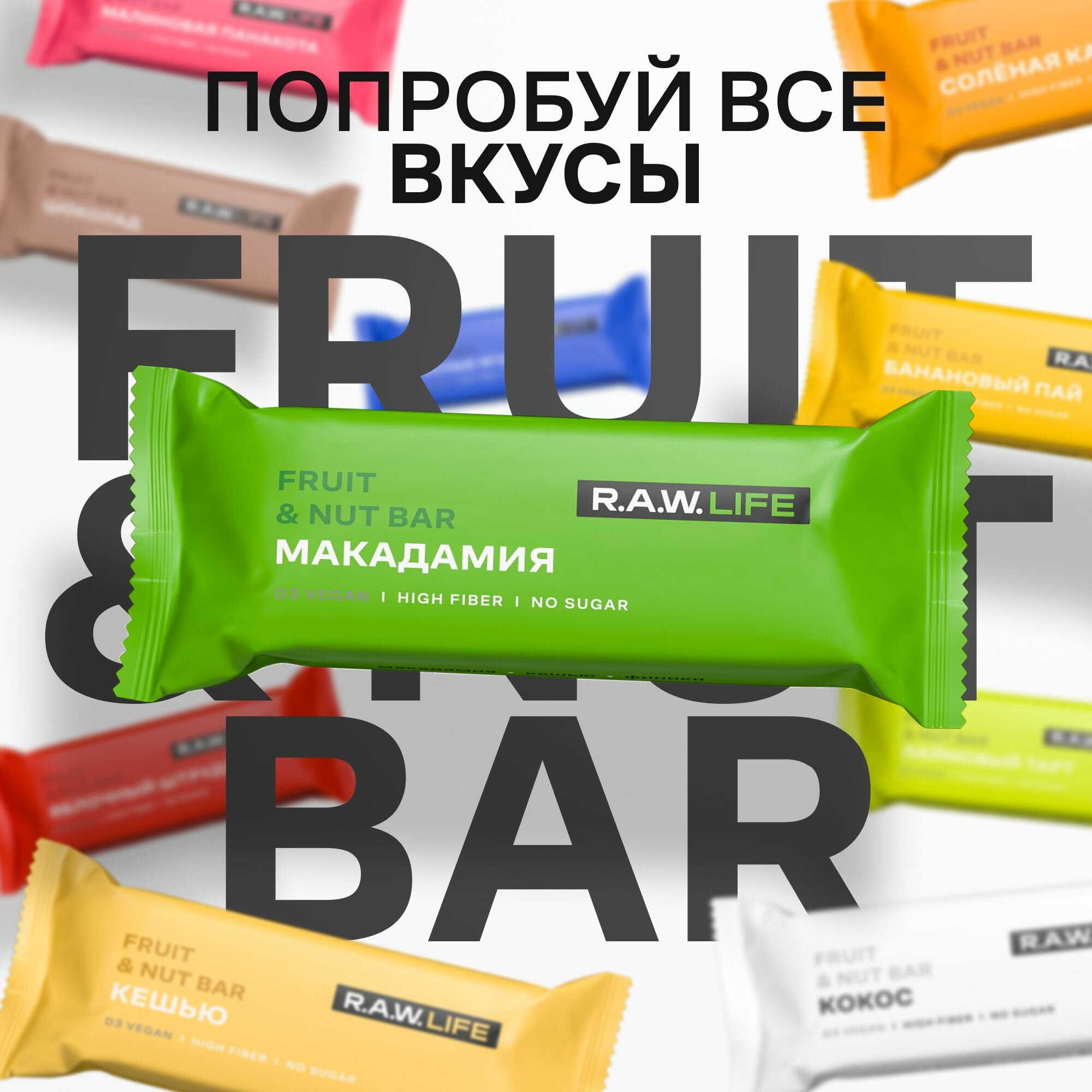 Батончики R.A.W.LIFE Fruit&Nut Bar / Фруктово-ореховый ассорти набор полезных пп сладостей без сахара, лактозы и глютена / MIX Dessert 5 вкусов 15 шт по 47 гр