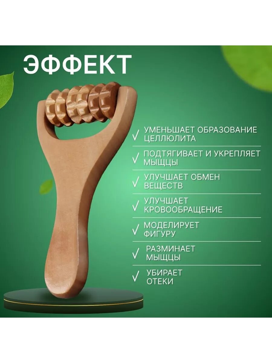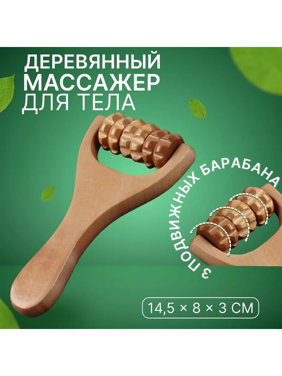 ONLITOP Массажёр роликовый, деревянный, с ручкой, универсальный, 14,5 × 8 × 3 см, 3 барабана