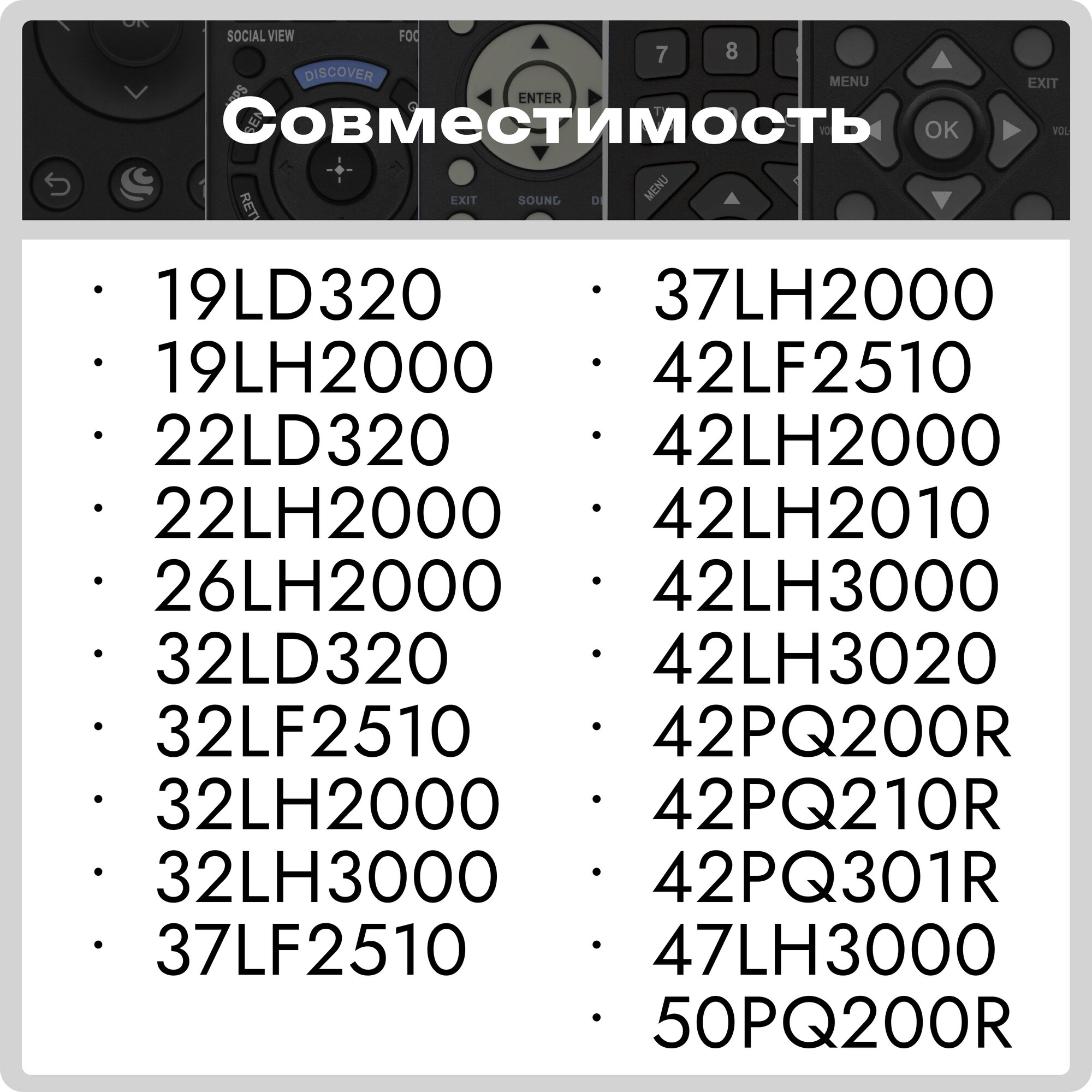 | Назначение | LG 19LD320, LG 22LD320, LG 22LH2000, LG 26LD320, LG 26LH2000, LG 32LD320, LG 32LH2000, LG 32LH3000, LG 37LF2510, LG 42LF2510, LG 42PQ200R, LG 42PQ210R, LG 47LH3000, LG 50PQ200R |