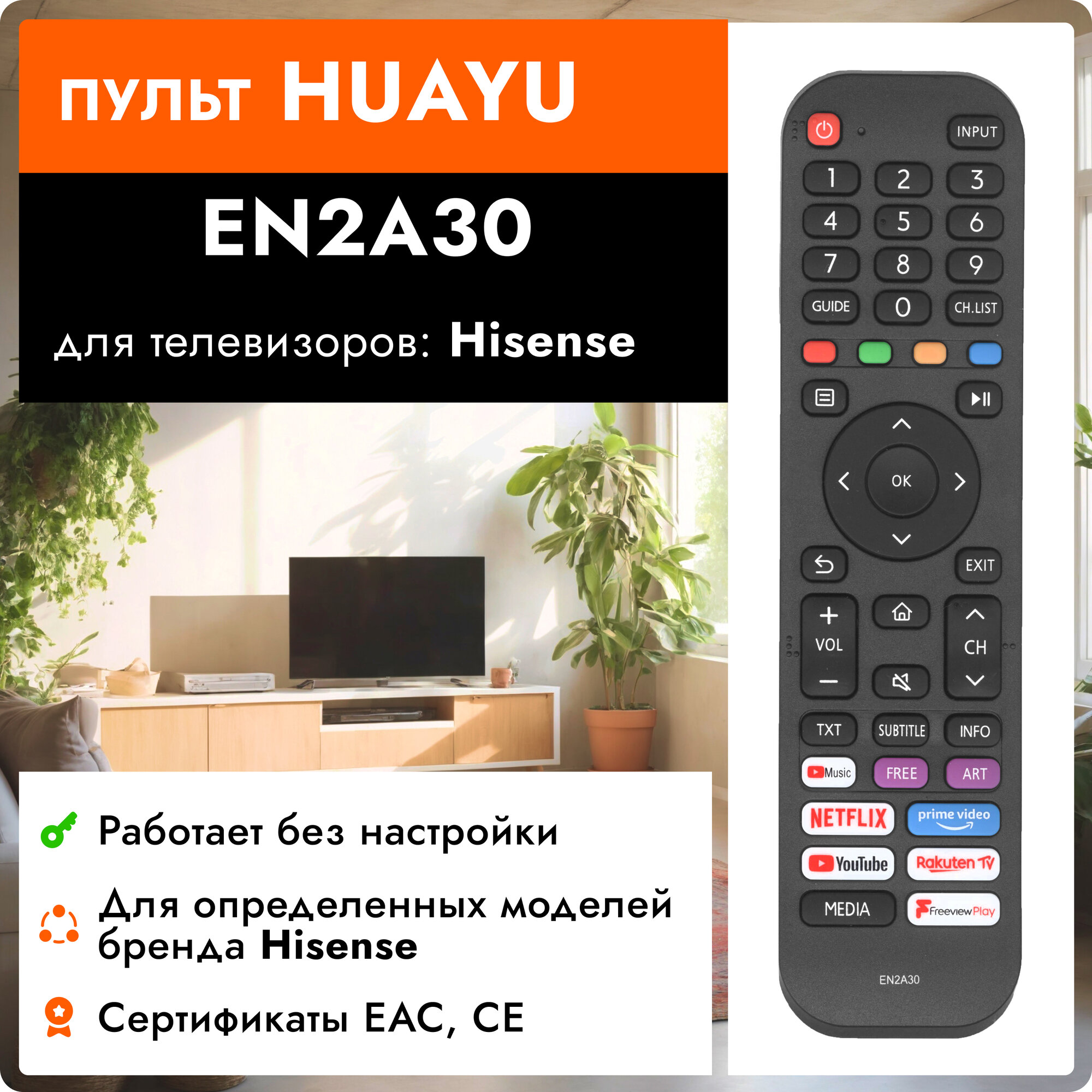 Пульт HUAYU для телевизора Hisense EN2A30, 55AE7400F