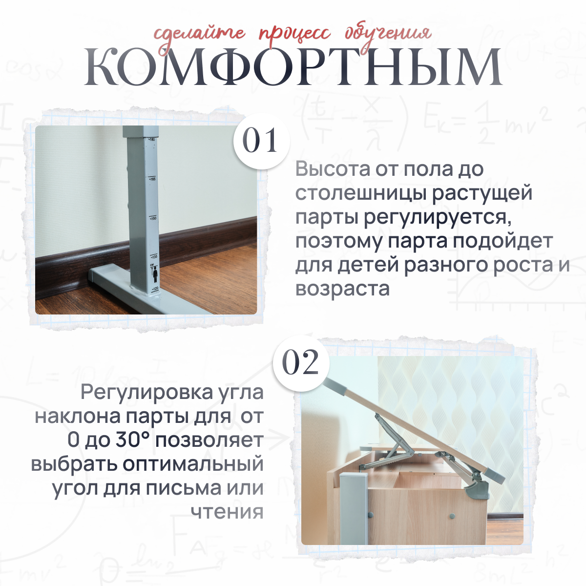Парта растущая ДЭМИ СУТ-29 с тумбой, размер 110х50х76 см цвет ЛДСП ясень, накладки серые, ноги серые интересное: