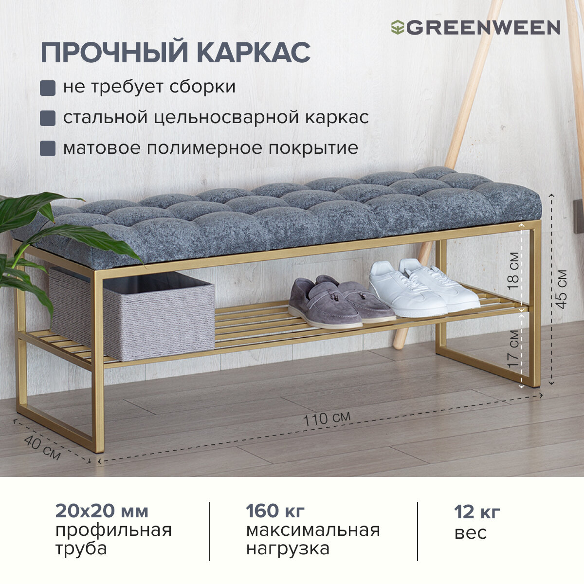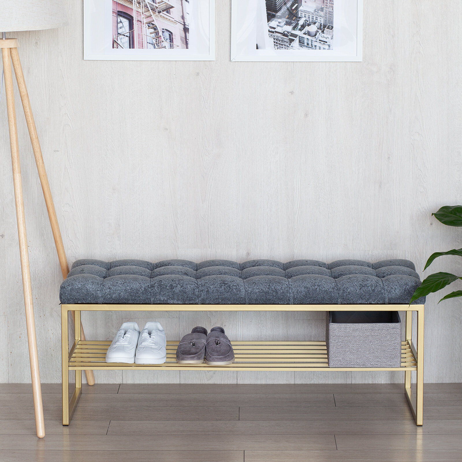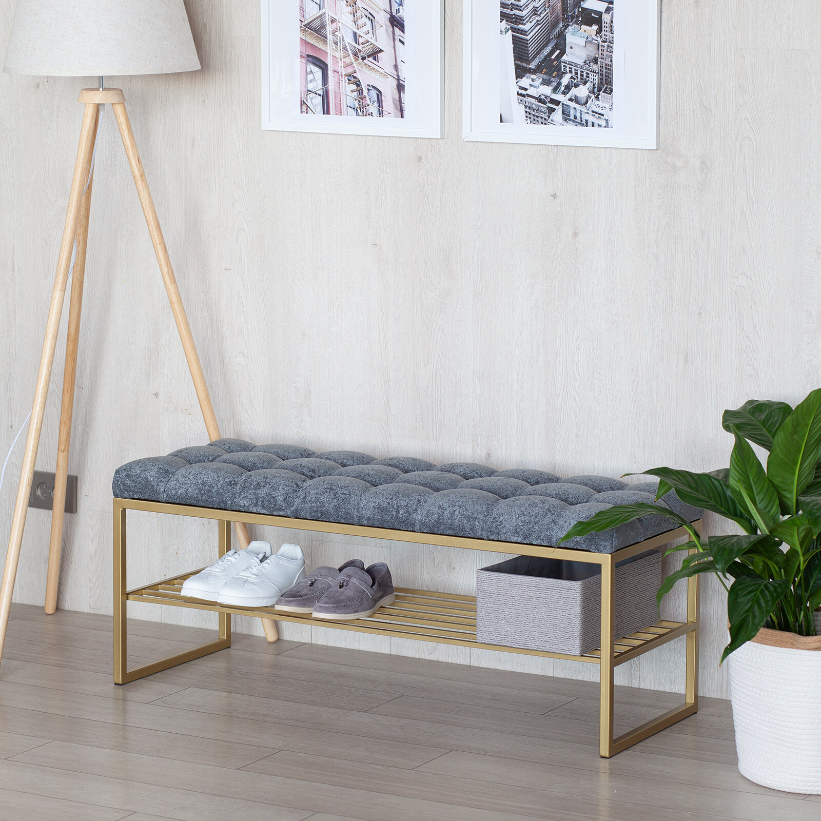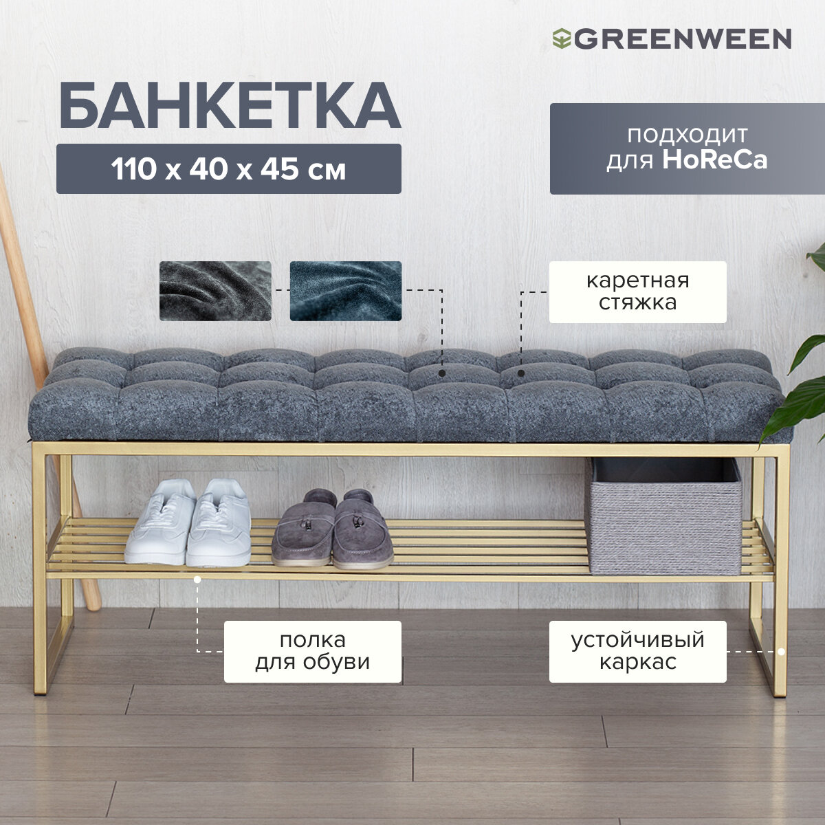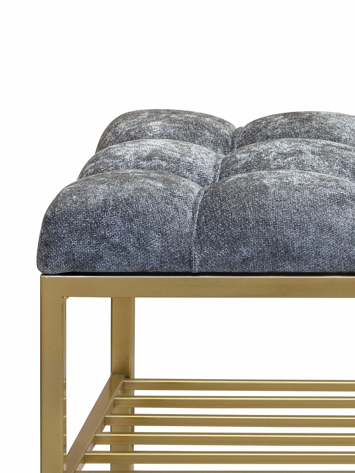 Купить Банкетка в прихожую RUBY, золотая, Steel Grey, каретная стяжка, 1100х400х450