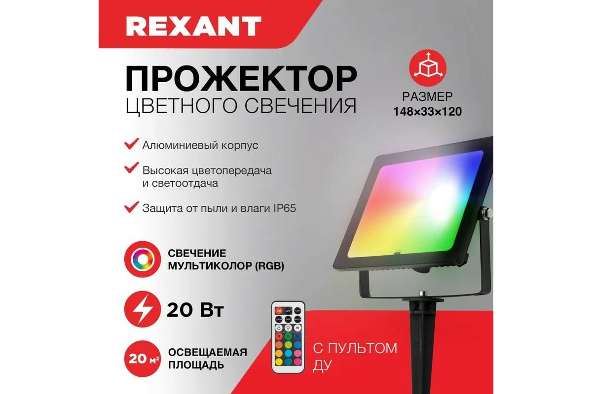 Прожектор цветного свечения REXANT мультиколор (RGB) 30 Вт с пультом ДУ