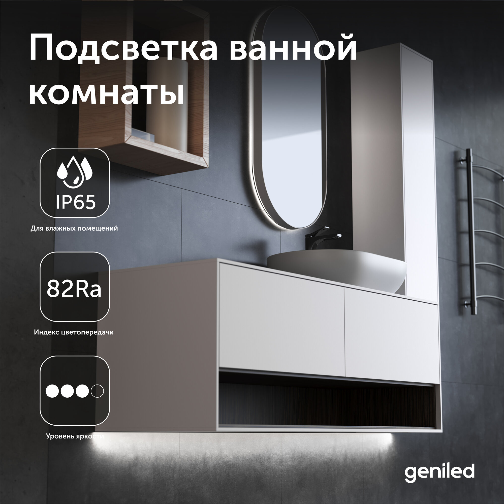 Светодиодная лента, подсветка Geniled - для комнаты, в гардероб, на кухню, на улицу, в ванную - Белый Нейтральный свет / GL-180SMD2835 / 1590 Лм/м / 12В / Длина - 5м / B - 10 мм / W - 16 вт / 4200 К / IP65