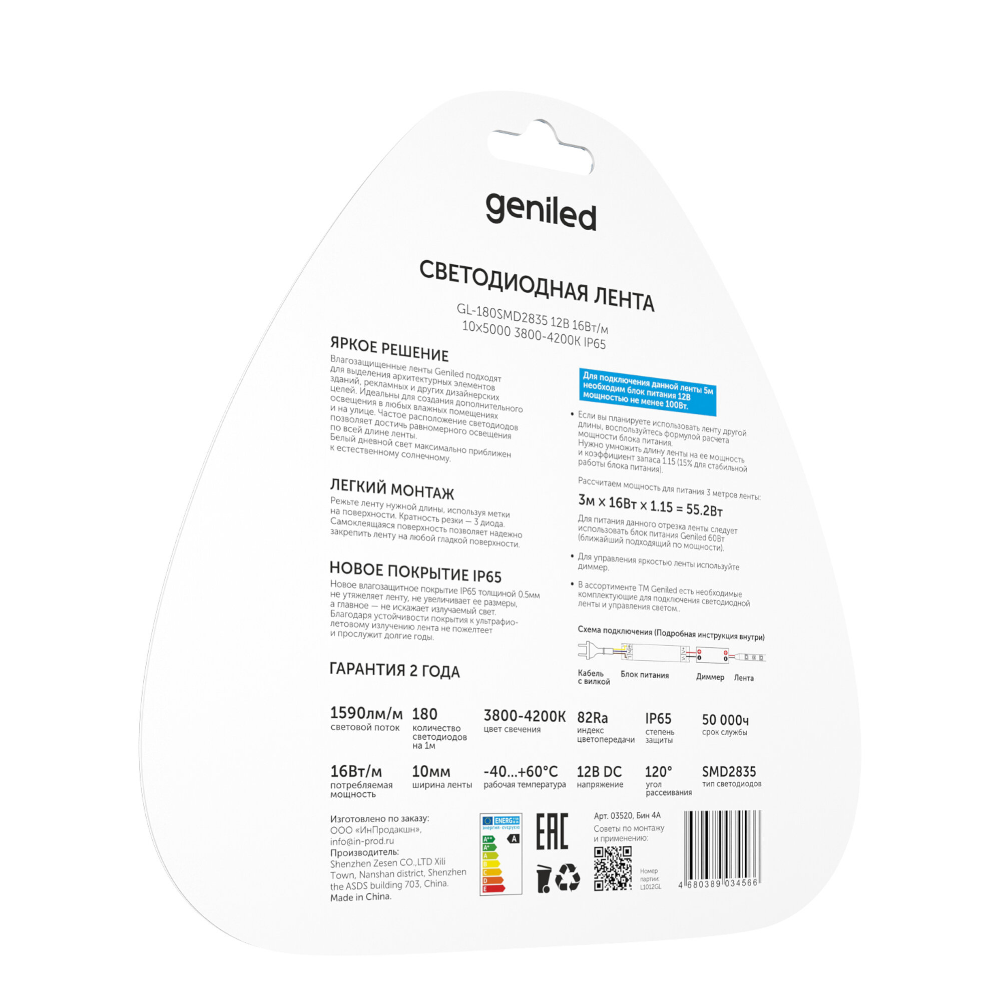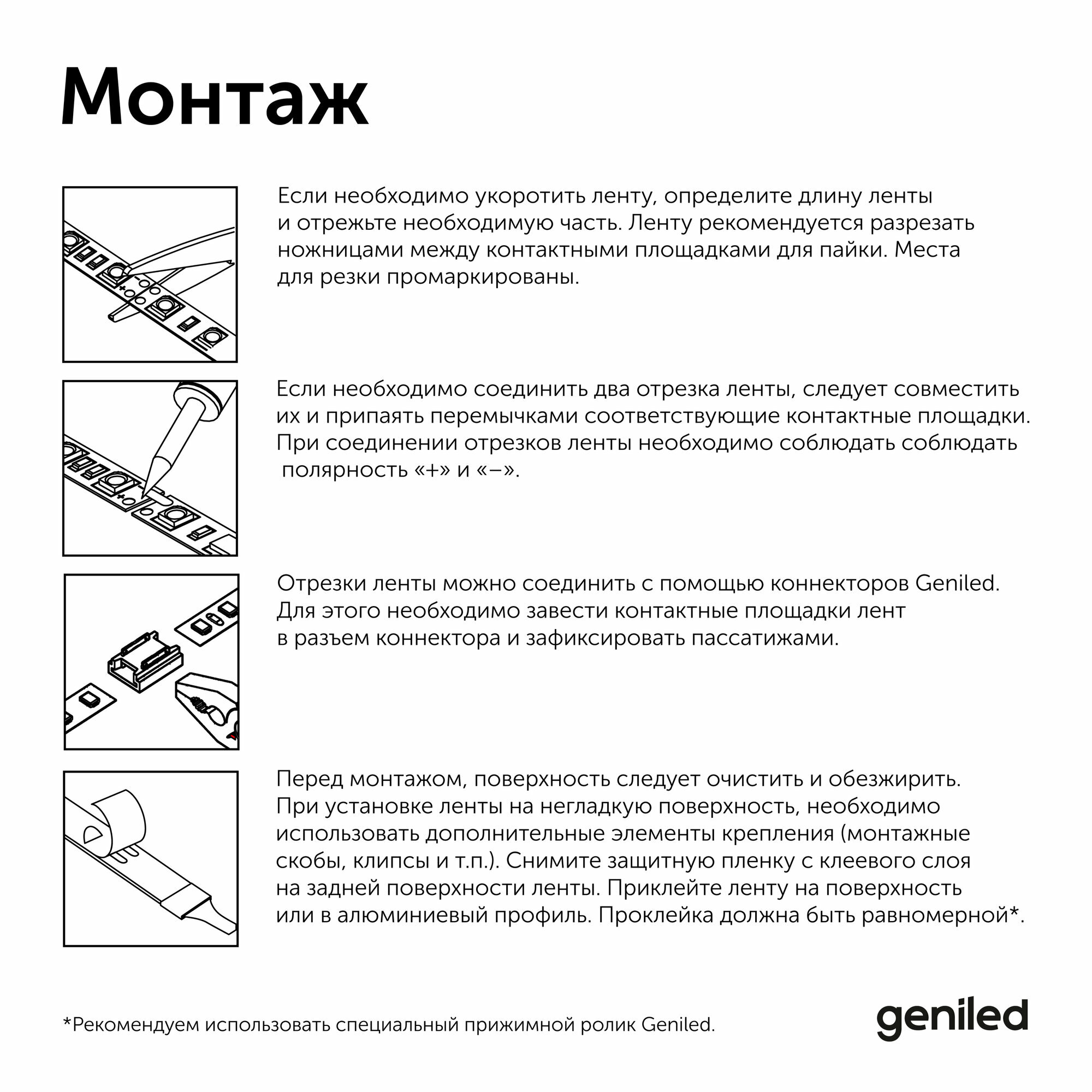 Светодиодная лента, подсветка Geniled - для комнаты, в гардероб, на кухню - Белый Нейтральный свет / GL-180SMD2835 / 1390 Лм/м / 24В / длина - 5м / B - 10 мм / W - 16 вт / 4000 К / IP33