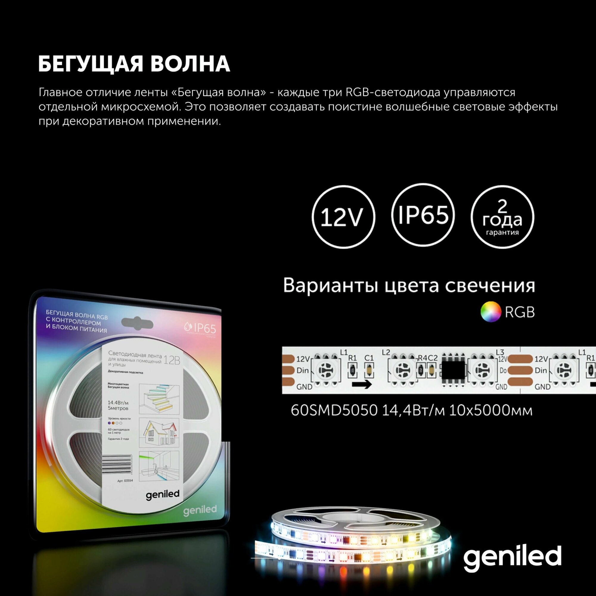 СохранитьСветодиодная лента, подсветка Geniled - для комнаты, в гардероб, на кухню Бегущая волна RGB с контроллером Wave GL-12V72WIR-B интересное: