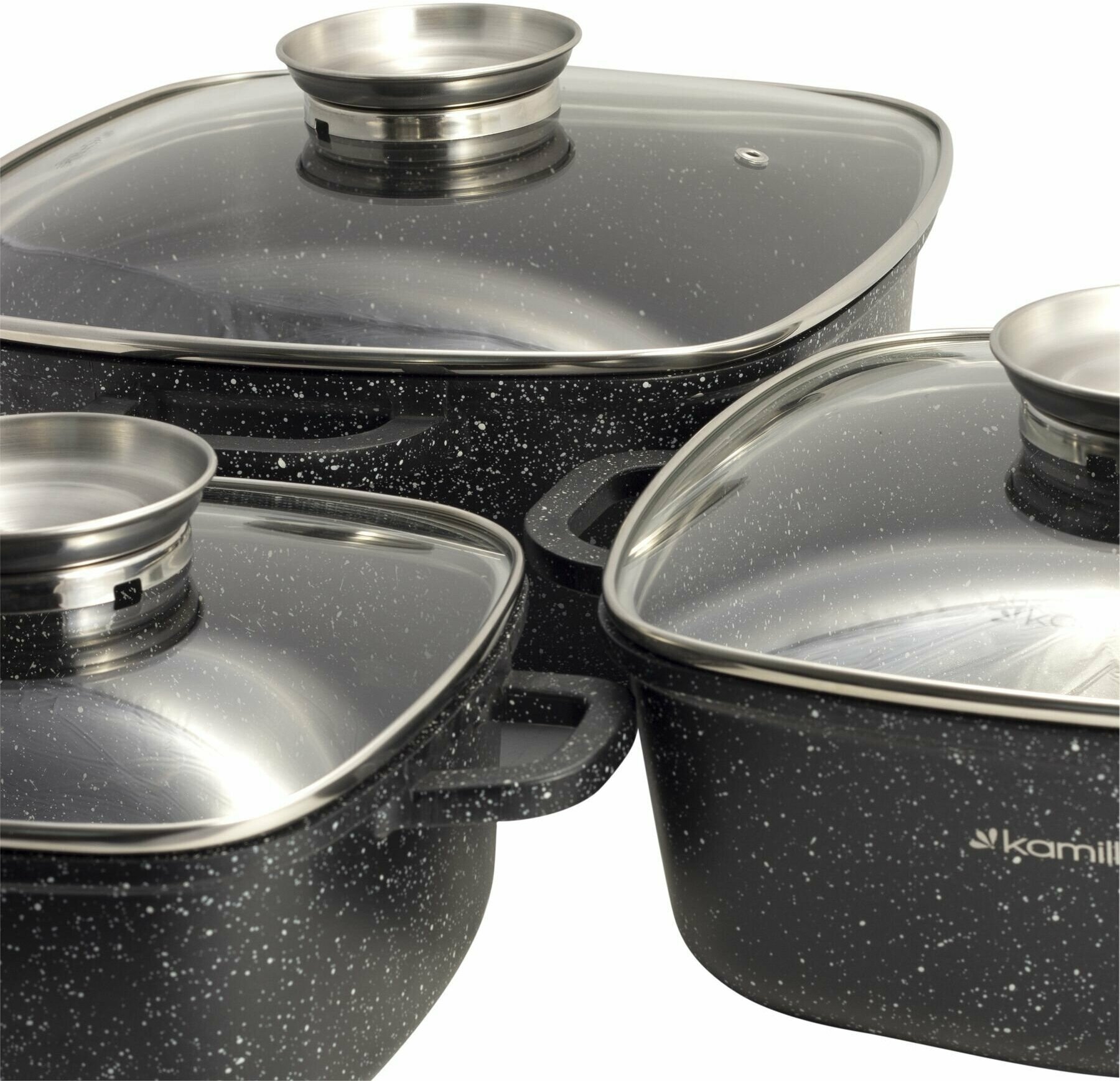 Набор посуды 7 предметов с прихватками Kamille KM-4435 (кастрюли квадратные 20см, 24см, 28см, прихватки 2шт) (черный)