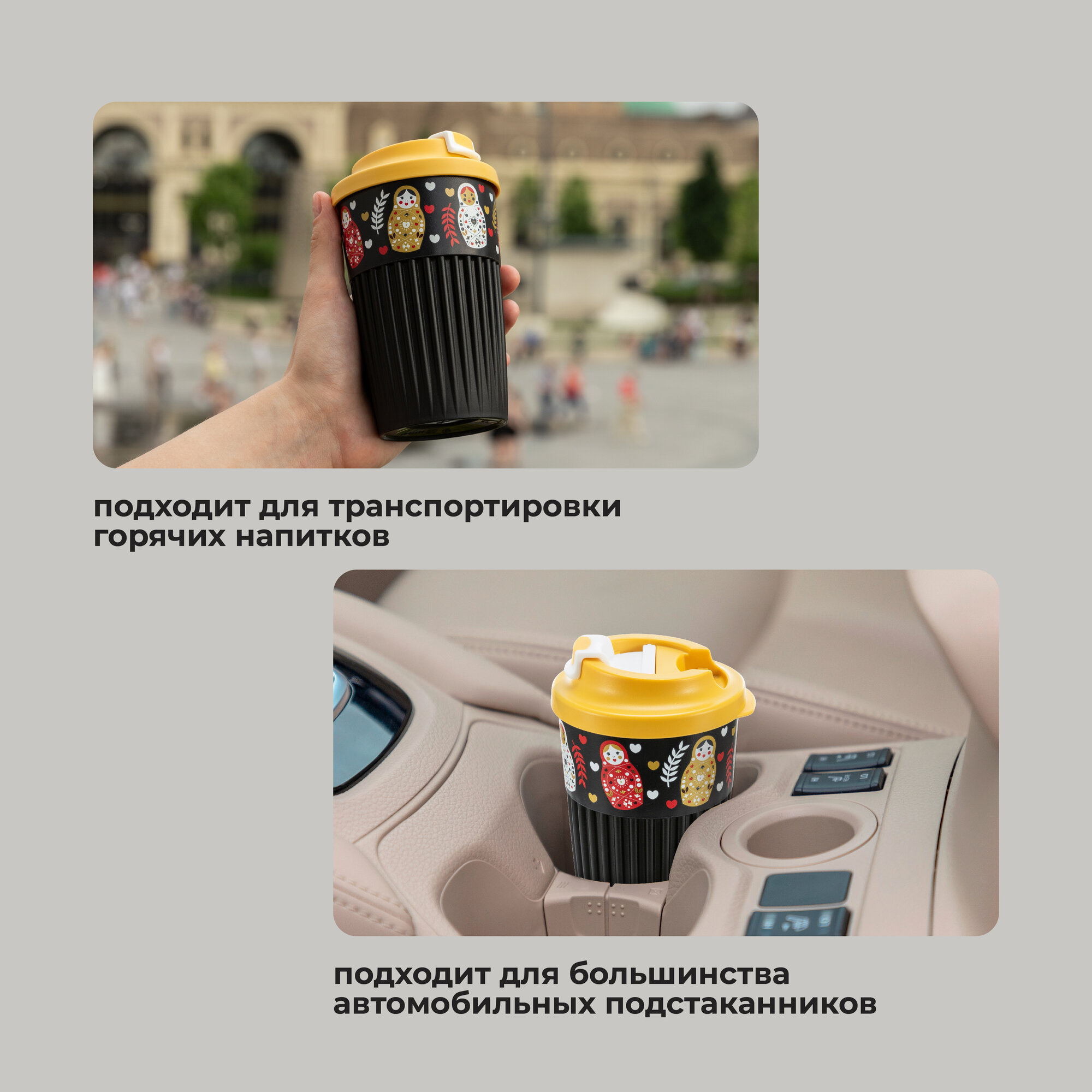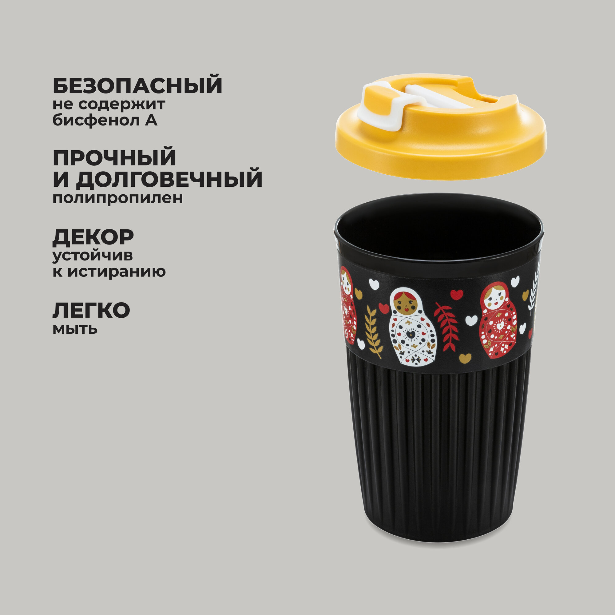Стакан для напитков с клапаном и декором Матрешки, 450мл (Черный)