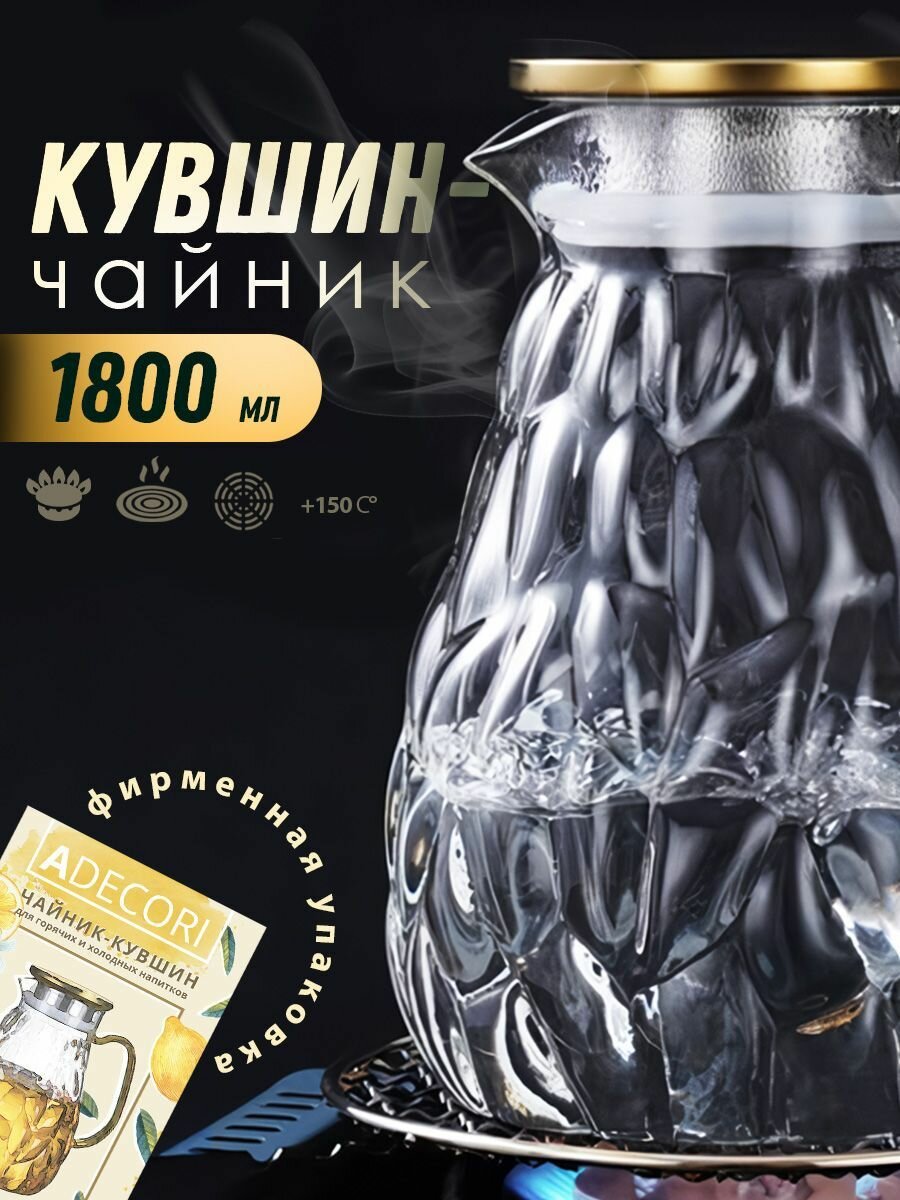 Кувшин стеклянный с крышкой для воды и напитков из жаропрочного стекла Шампань, 1900 мл (графин, чайник, заварник) ADECORI