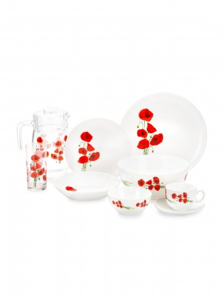| Комплектация | 6 х Тарелка обеденная 27 см 6 х Тарелка десертная 20,5 см 6 х Тарелка глубокая суповая 20 см 1 х Блюдо овальное 33 см 1 х Салатник большой 21 см 6 х Салатник малый 12 см 1 х Кувшин с крышкой 1,6 л 6 х Стакан 270 мл 6 х Чашка 220 мл 6 х Блюдце 14 см |