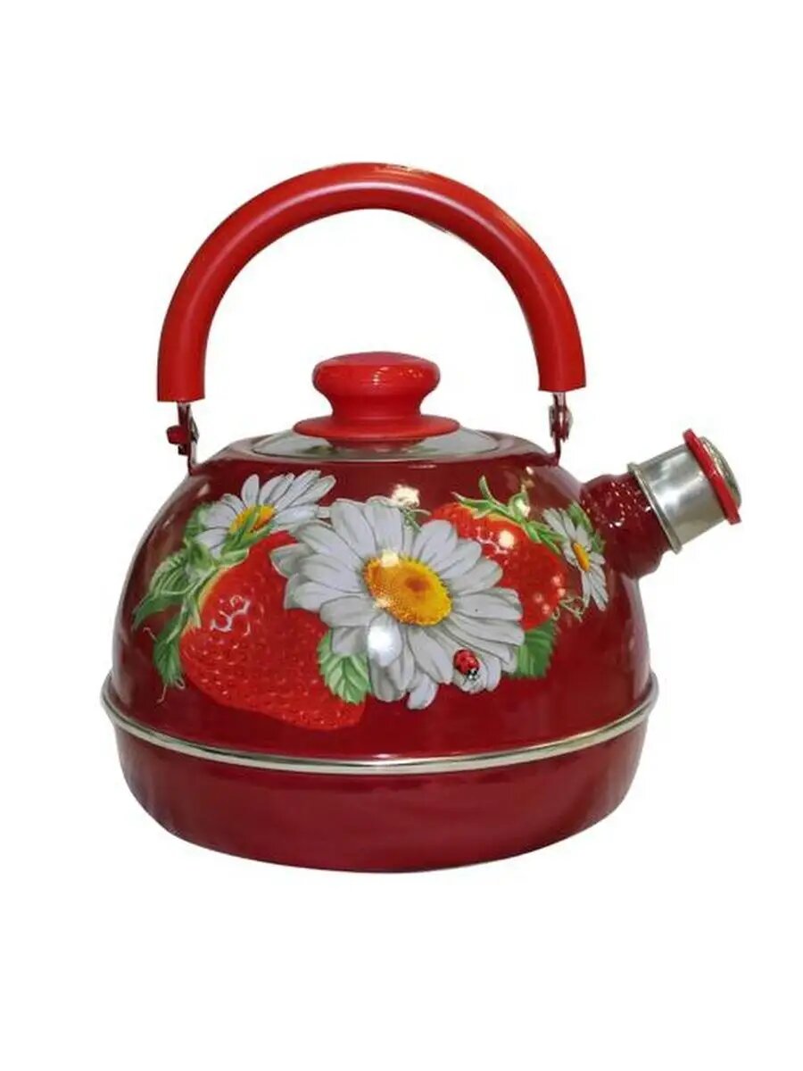 Чайник 3,5л. (крас. мет. подвиж. ручка) - бордовый / клубника с ромашкой (декор - нерж. сталь) TMM04