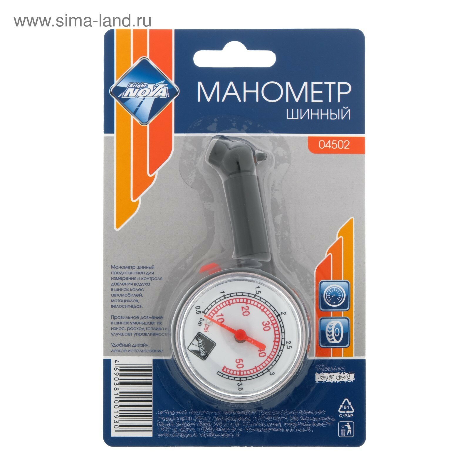 Манометр для шин механический ЕРМАК, до 3.5 атм хром, в блистере