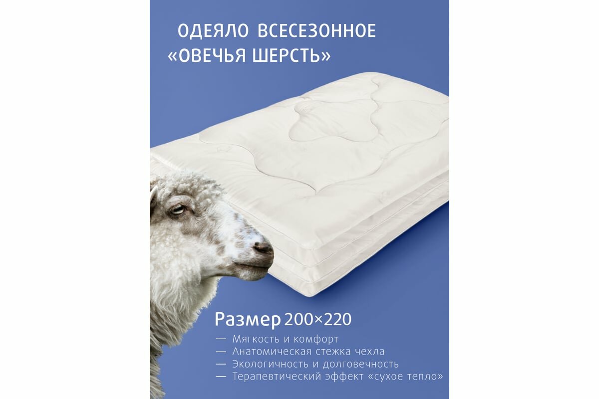 Одеяло летнее облегченное овечья шерсть евро (200x220 см) Долина снов "Овечья шерсть", чехол - микрофибра (100% п/э), Ecotex