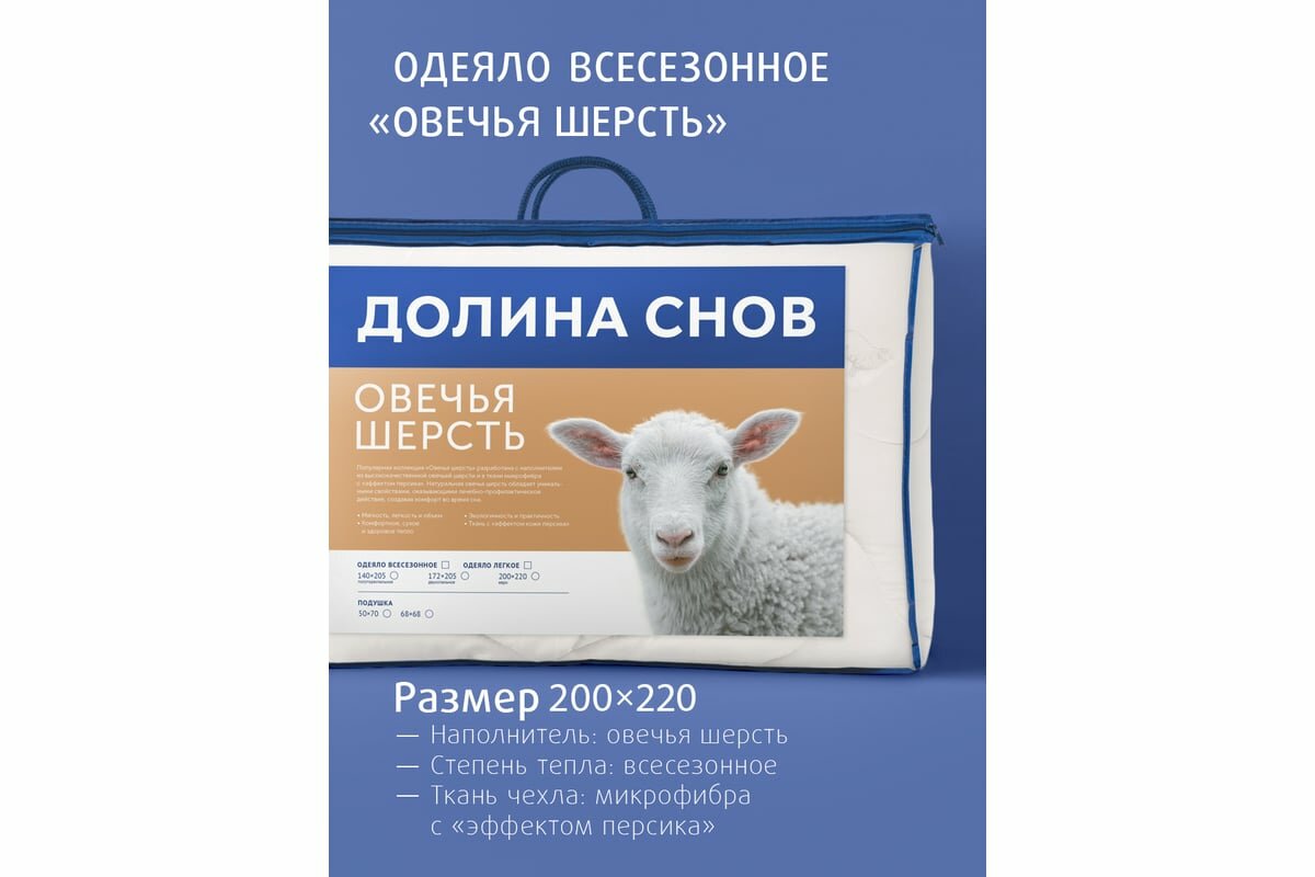 Одеяло овечья шерсть евро (200x220 см) Долина снов "Овечья шерсть", чехол - микрофибра (100% п/э), Ecotex