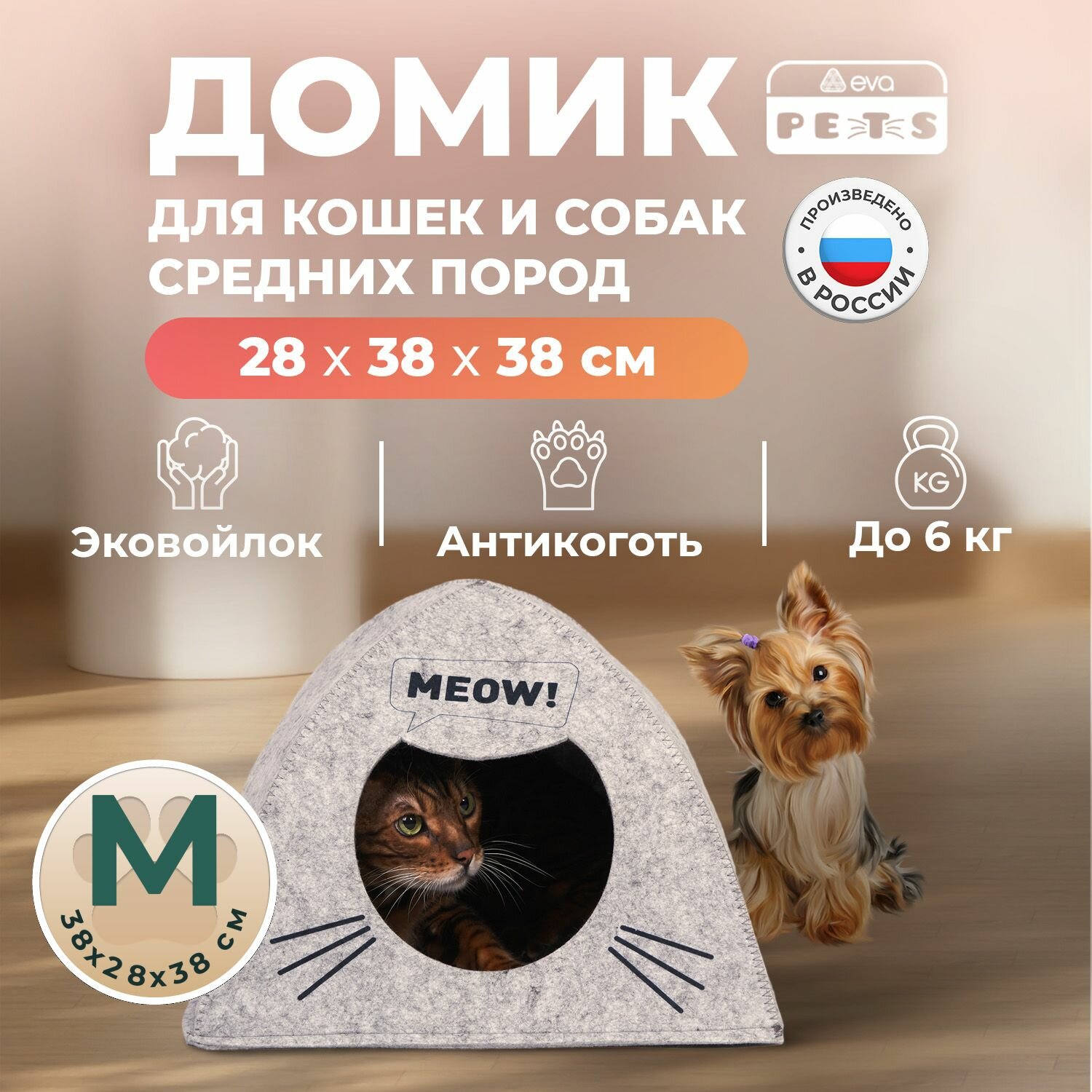 Домик для кошек и собак Eva "Палатка ушастая", лежанка для кошек собак мелких средних пород, войлочный, размер М