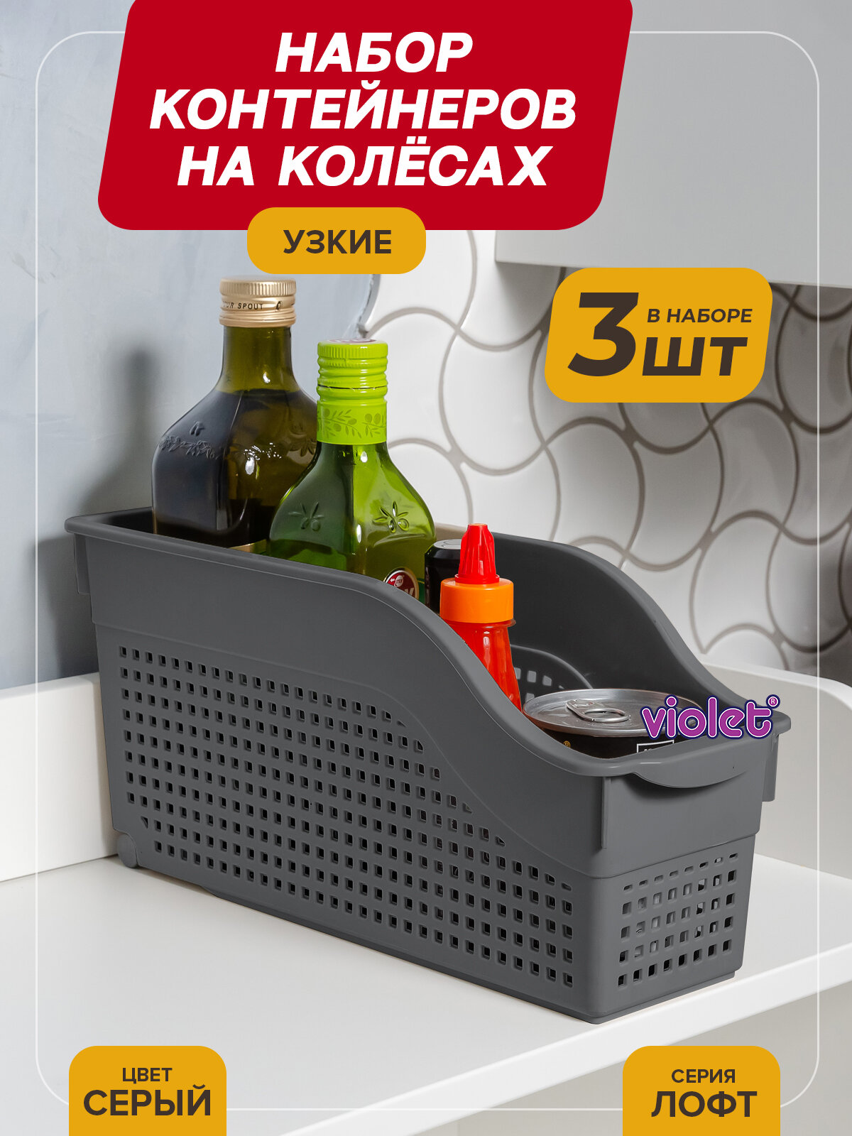 Контейнер для хранения на колесах узкий Лофт, набор 3шт, цвет серый / органайзер для кухни, ванной / контейнер хозяйственный