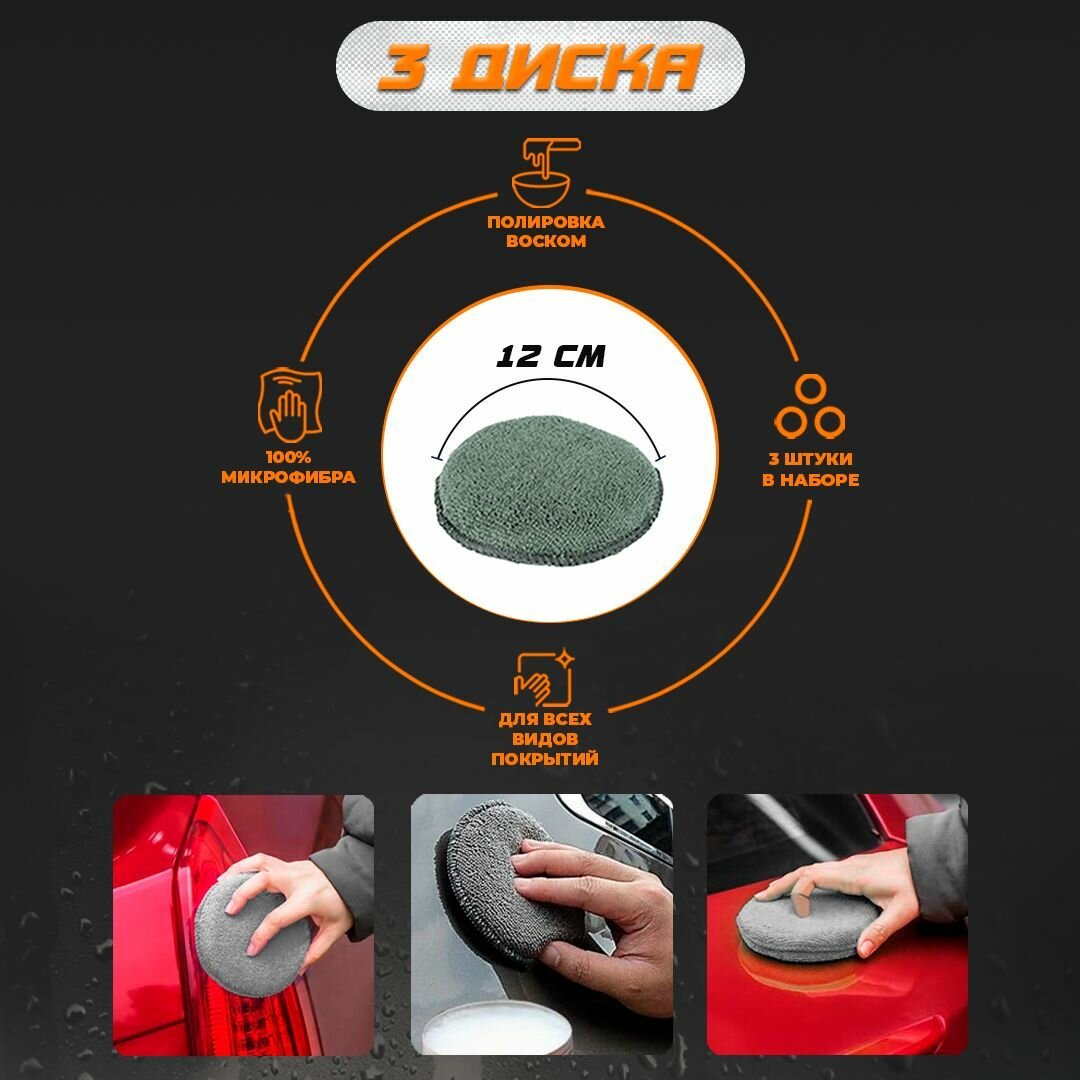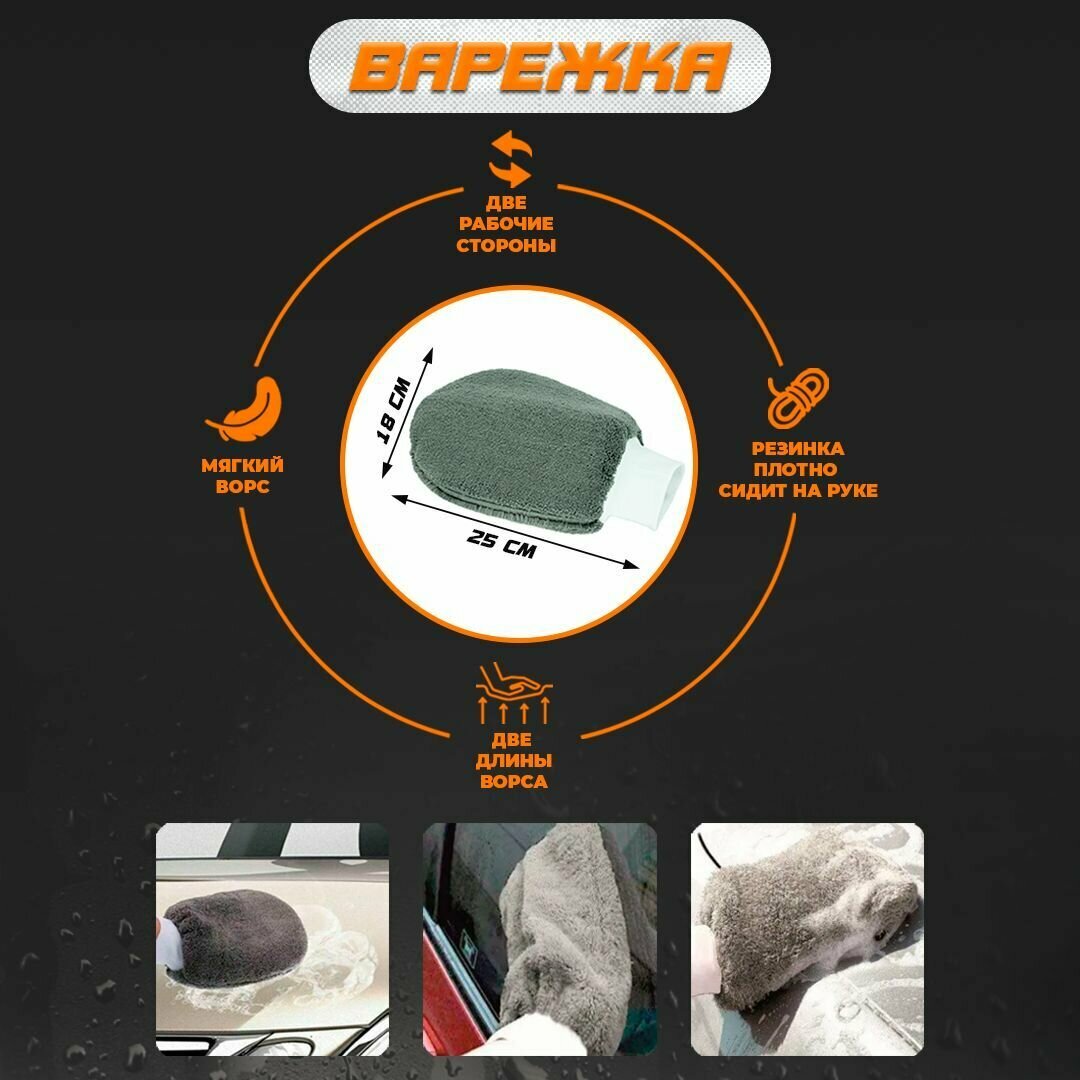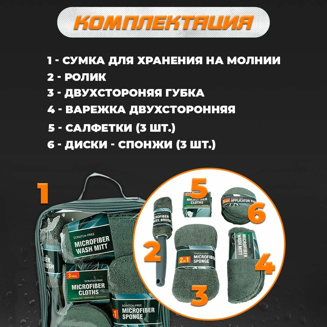 | Дополнительная информация | 9 предметов - варежка, 3 мягких диска, 3 салфетки из микрофибры, губка, ролик |