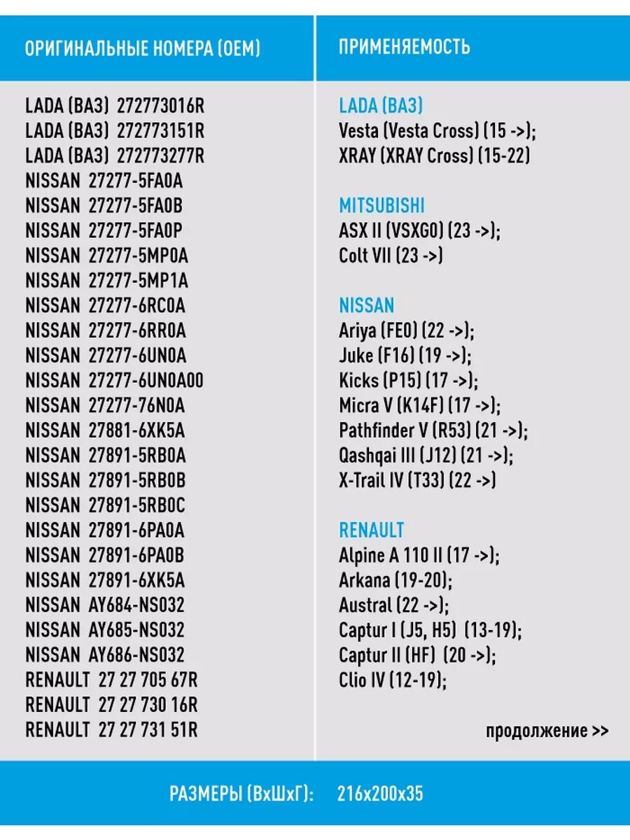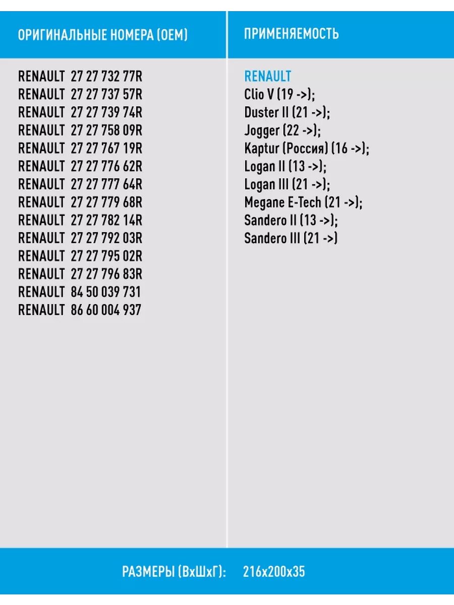 | Модель автомобиля | Great Wall Safe / LADA Largus / LADA Largus Cross / LADA Vesta / LADA Vesta SW Cross / LADA X-RAY / Lada Vesta SW / Mitsubishi ASX / Nissan Juke / Nissan Micra / Renault Arkana / Renault Captur / Renault Clio / Renault Duster / Renault Kaptur / Renault Logan / Renault Sandero |