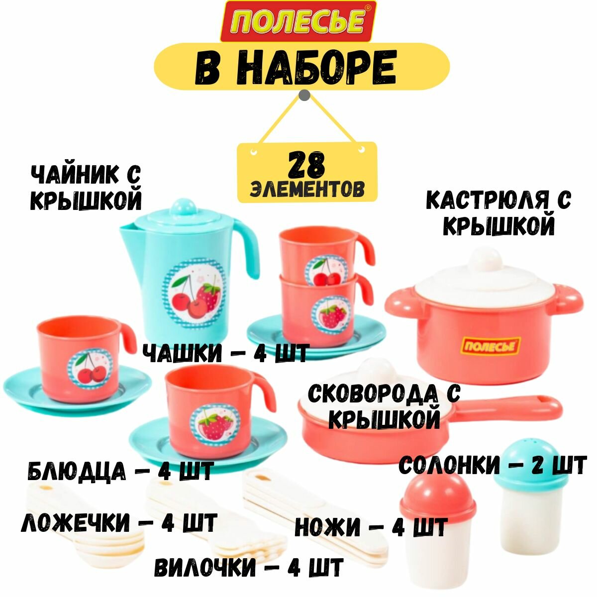 Игровой Набор Посуда. Настенька (на 4 персоны, 28 предметов, пластик, в сетке, от 3 лет) 79930, (Полесье)