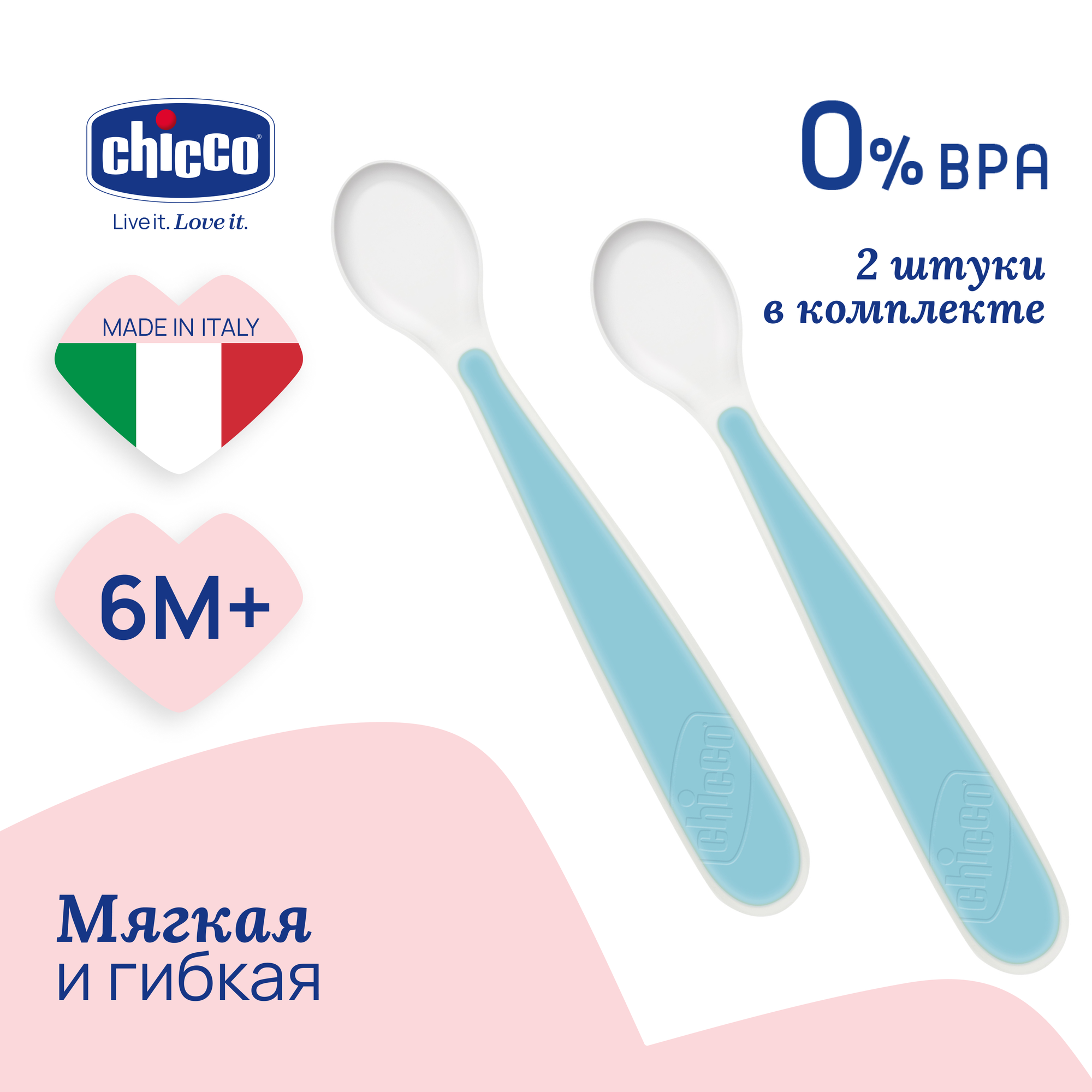 Купить Ложка детская для кормления Chicco мягкая силиконовая от 6 месяцев 2 шт голубая