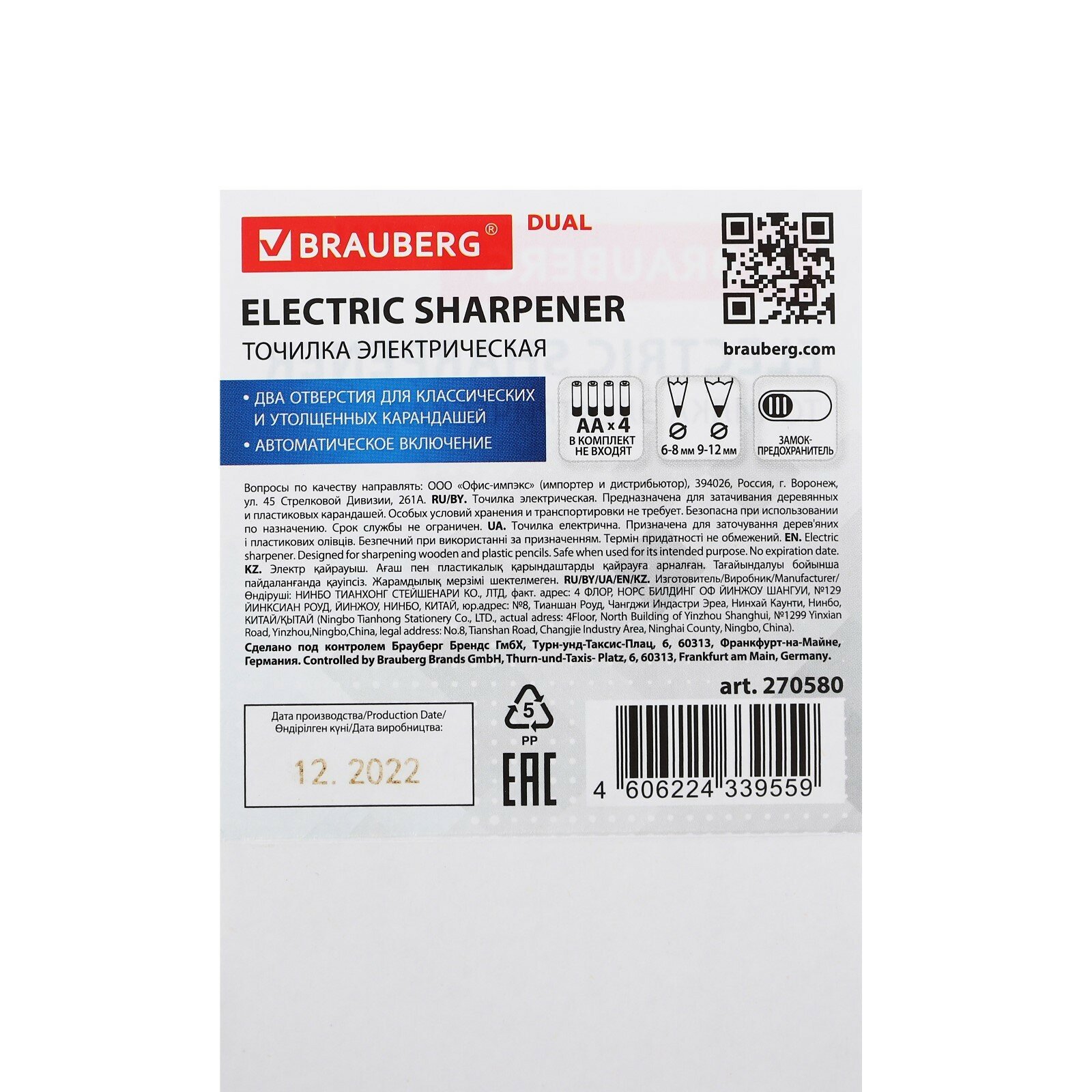 Точилка Brauberg электрическая DUAL (для 2 диаметров карандашей!), 4 батарейки АА, черная, 270581