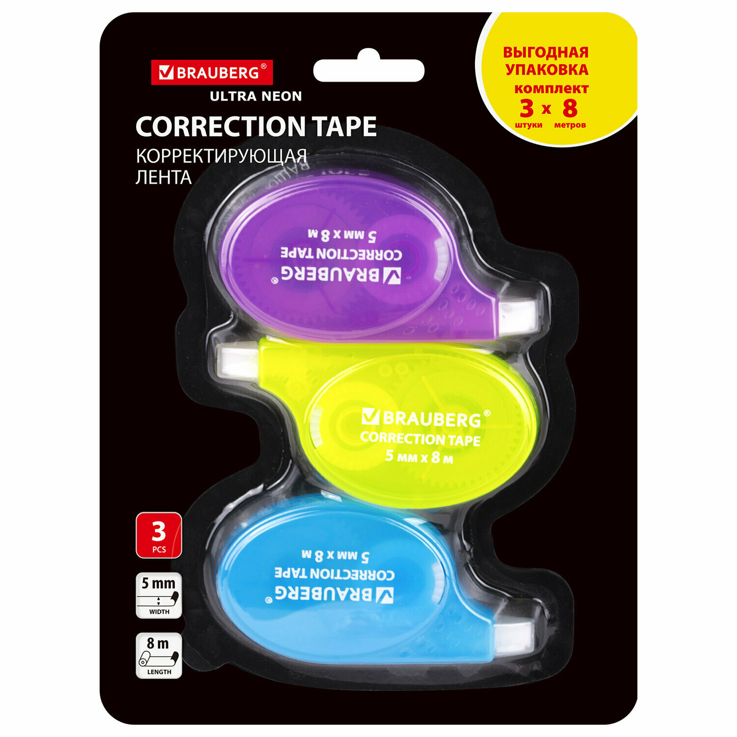 Купить Замазка ленточная канцелярская для школы, набор 3 штуки, корректирующая лента, штрих корректор 5 мм x 8 м, Brauberg Ultra Neon, 272665