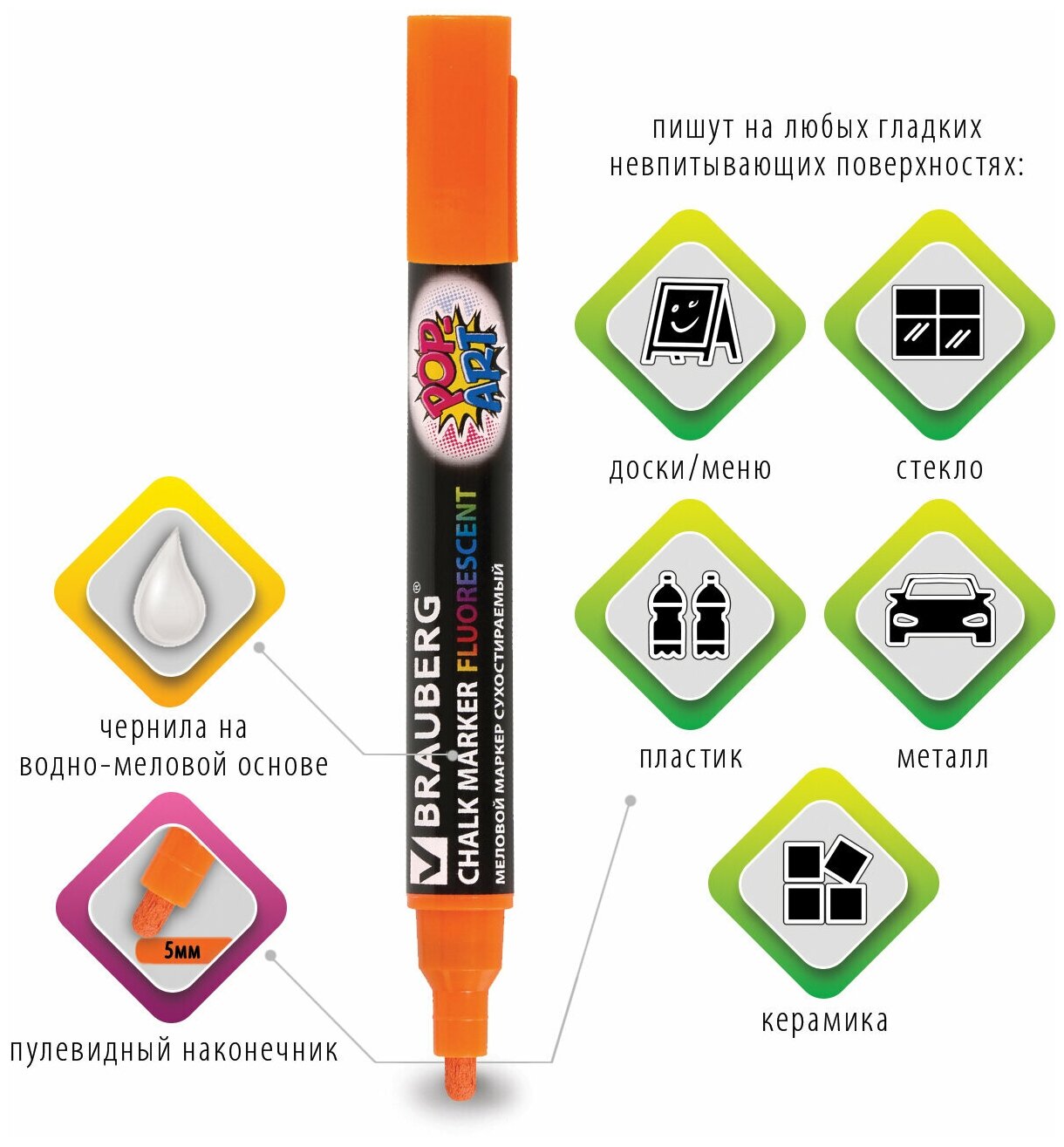 Купить Маркеры / фломастеры меловые стираемые для доски и других поверхностей Pop-art Оранжевый, 5 мм, стираемый, для гладких поверхностей, Brauberg, 151531
