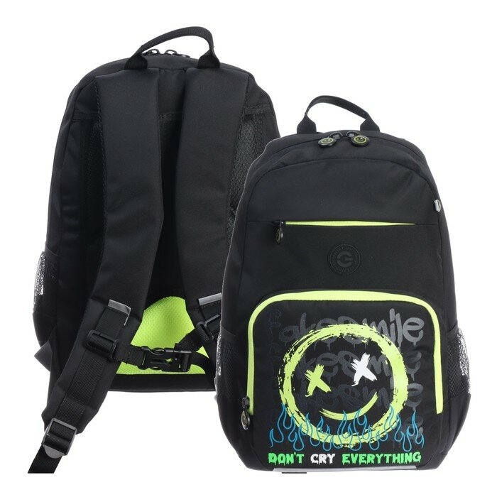 Школьный рюкзак с ортопедической спинкой GRIZZLY RB-455-1/1 черный - хаки, грудная стяжка, 2 отделения, 662 грамм, 40x25x13см