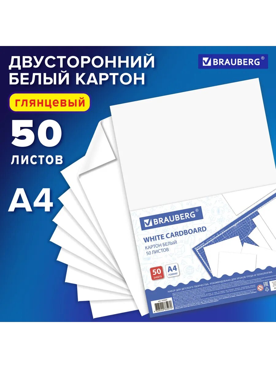 Картон белый А4 МЕЛОВАННЫЙ (белый оборот), 50 листов, в пленке, BRAUBERG, 210х297 мм, 113563